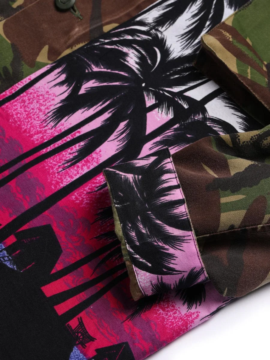 British camouflage shirt with half body vintage Hawaiian aloha shirt applied on front and pocket detail.
