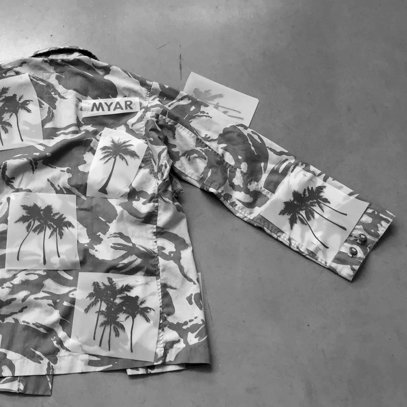 British desert camouflage shirt with transfer print of blue palm tree graphic.