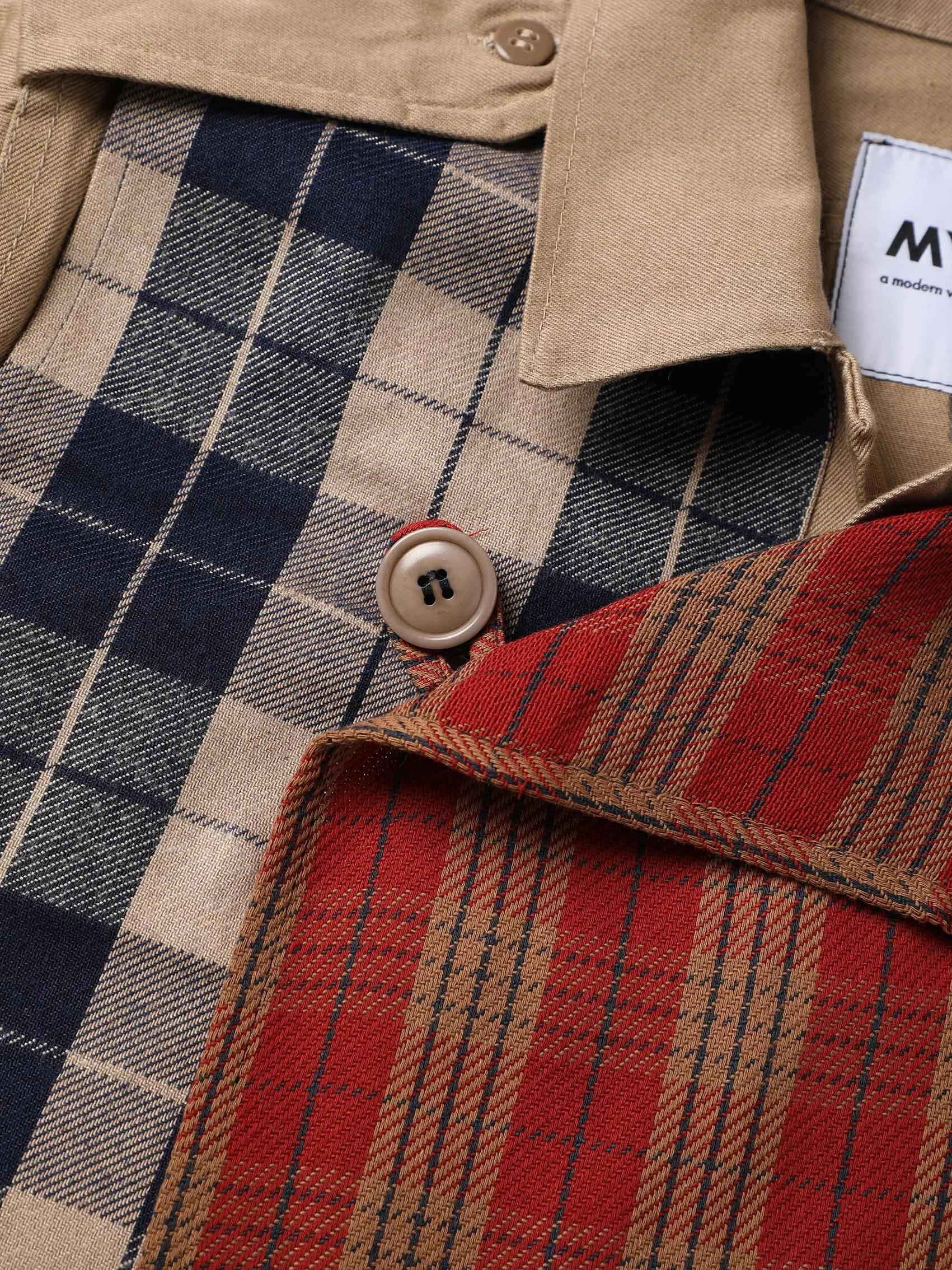 Khaki color greek shirt with two check repeat applied on the front left fixed to the original shirt and the front right that folds down on the upper part and it can be hooked on a vintage military button with a fabric eyelet . The two checks front panels have different height.