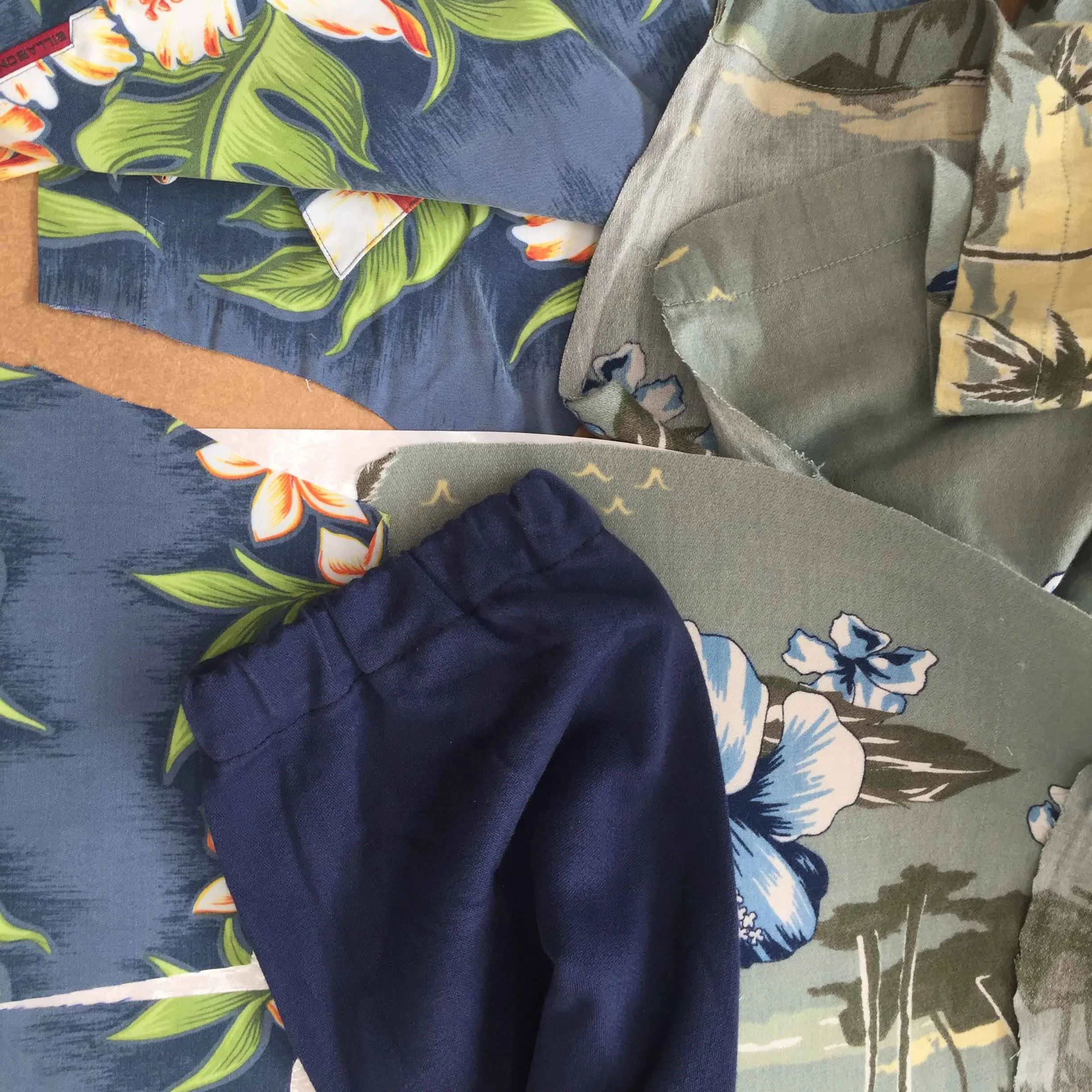Cotton pants with hawaiian shits stripe applied on side seam.
