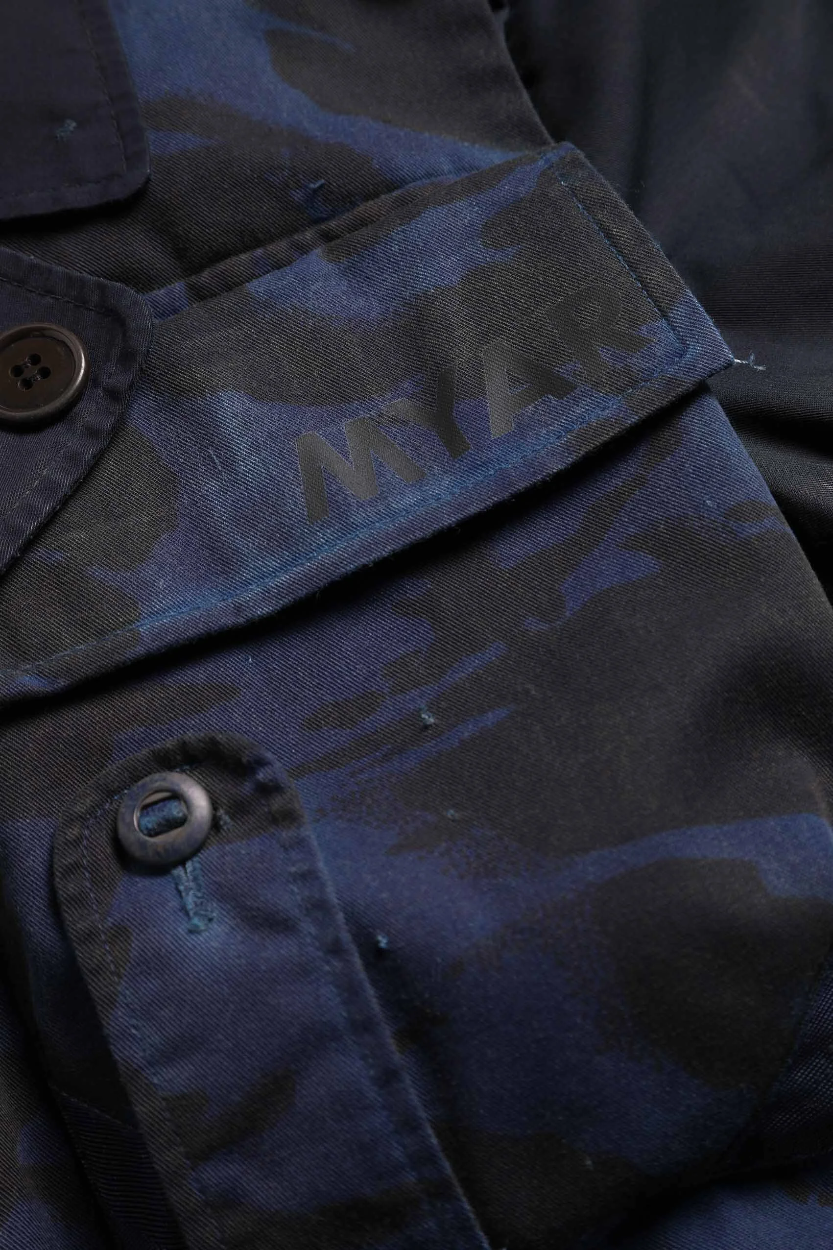 We kept the original name of the soldier on the front pocket when present, and add the MYAR black transfer logo on top of the flap. This particular garment has been cold garment dye in navy blu color.