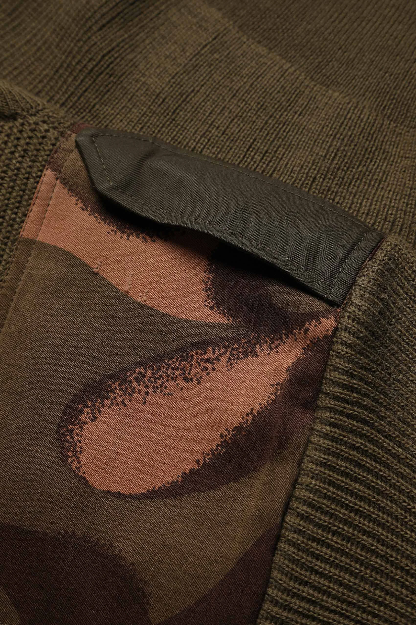 This army green, Italian rib knit sweater has woven reinforcement on both elbows and shoulders.