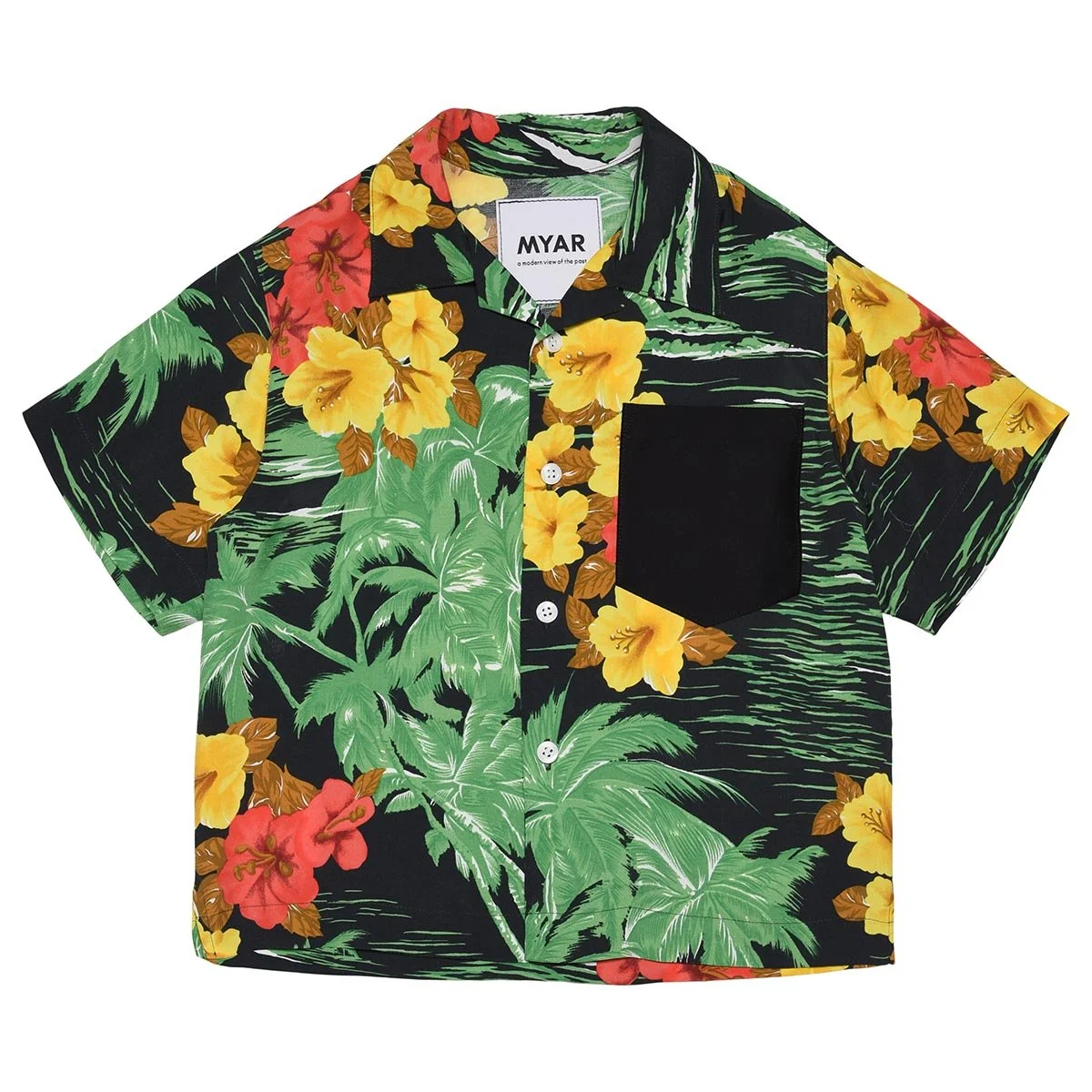 Hawaiian-style shirt made from a Hawaiian-patterned deadstock fabric.