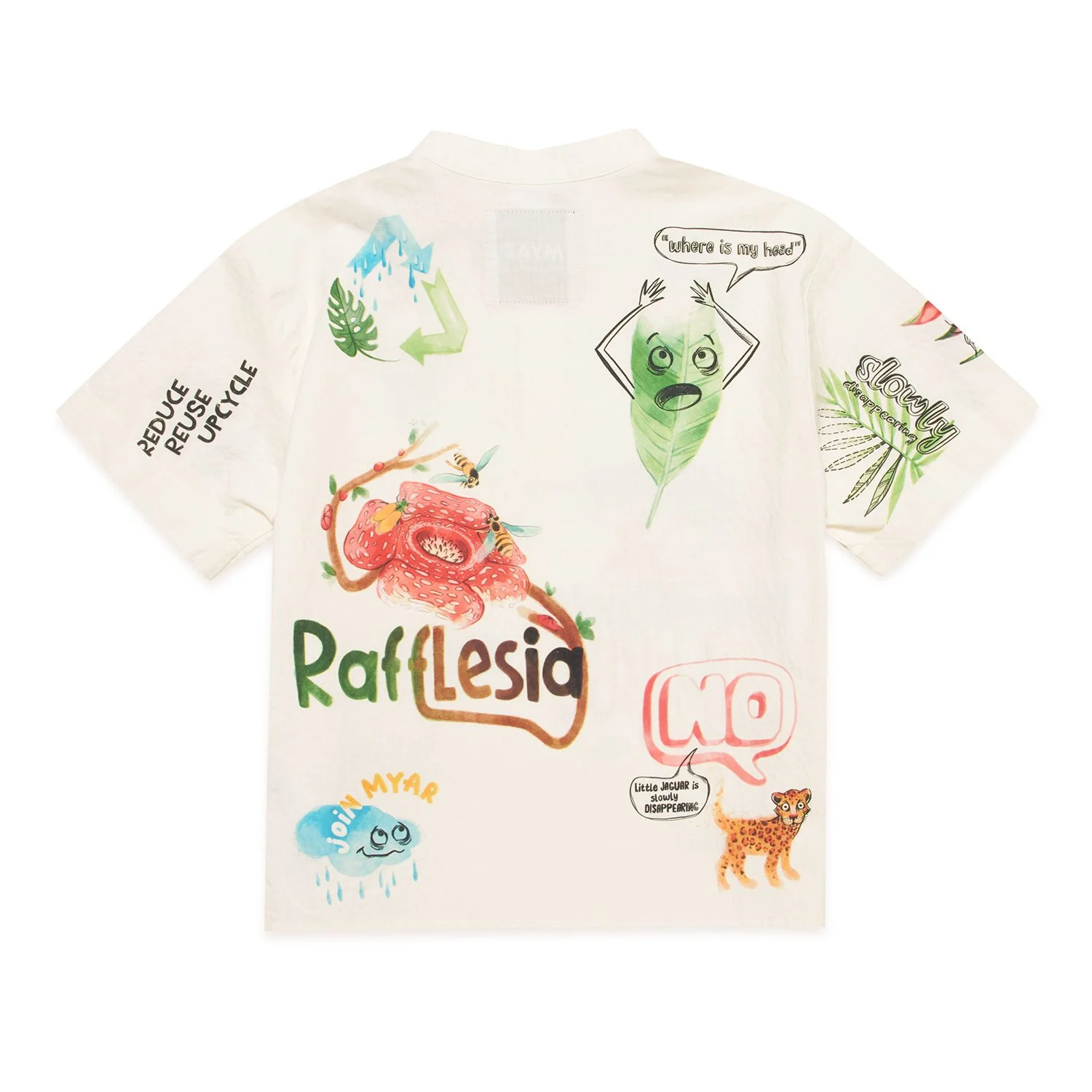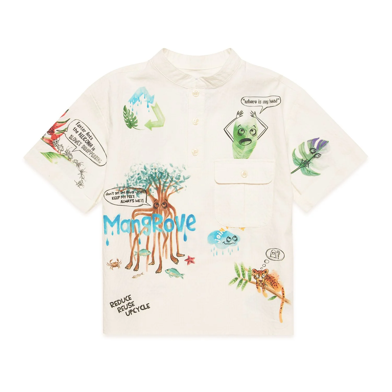 Shirt with mandarin collar and button fastening, made from deadstock sirsucker linen-blend fabric, digitally printed with water colours on a white background. Patch pocket on the chest on the heart side with button fastening.Shirt with mandarin collar and button fastening, made from deadstock sirsucker linen-blend fabric, digitally printed with water colours on a white background. Patch pocket on the chest on the heart side with button fastening.