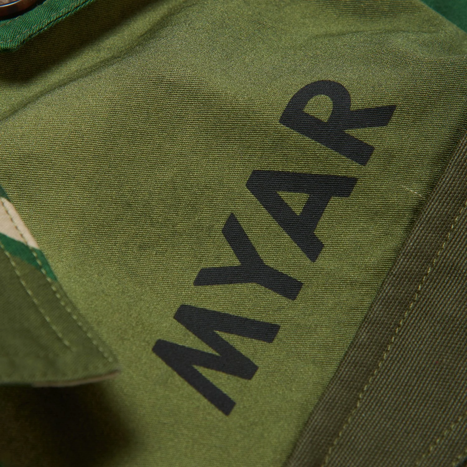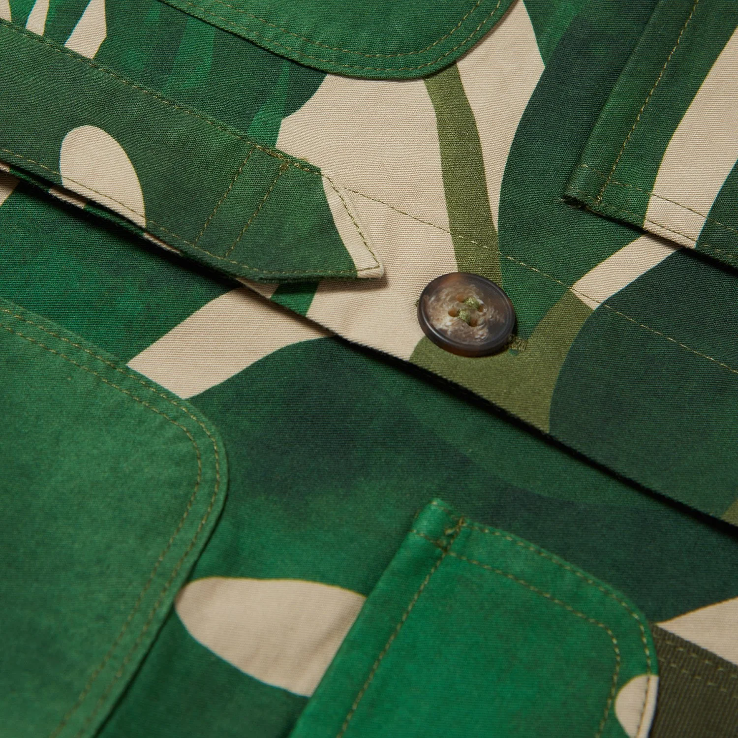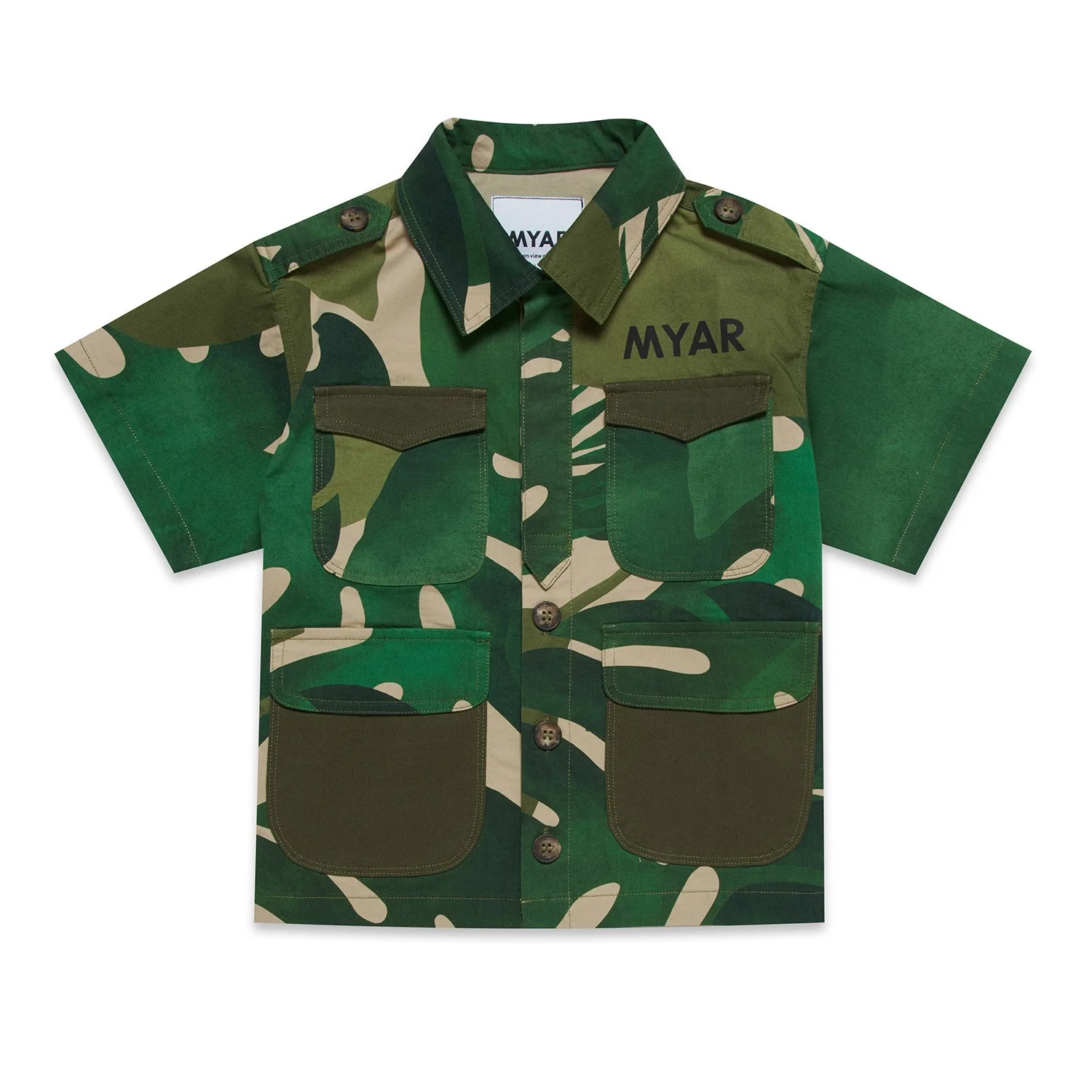 Shirt made from rainforest patterned printed deadstock fabric, with four patch pockets on the front made up of alternating plain and printed fabric details.MYAR logo printed with bio-based water-based colour on the chest on the heart side.