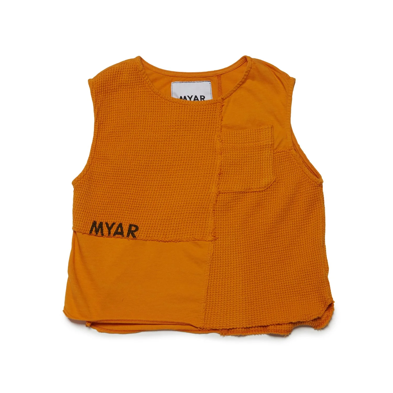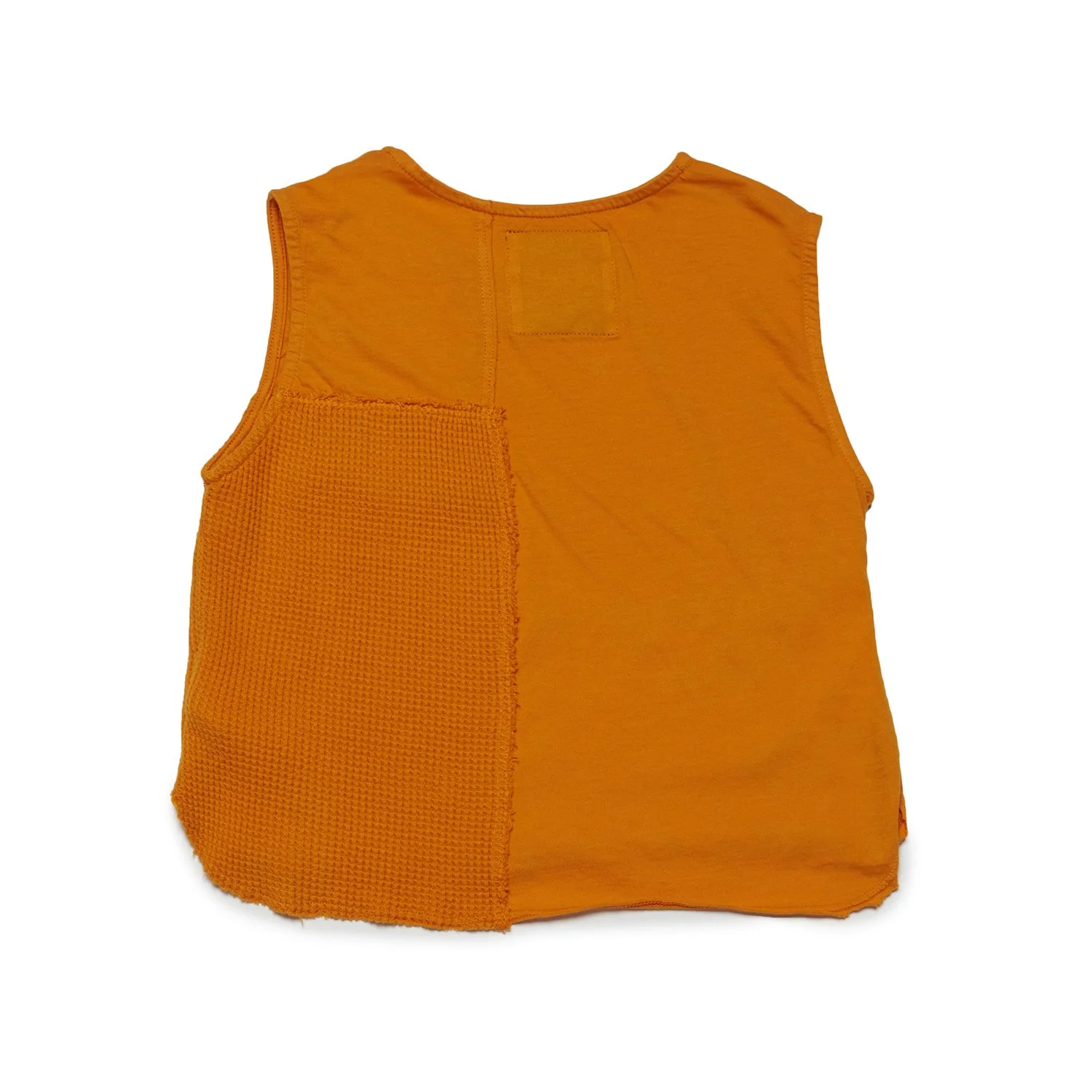 Garment-dyed tank top made from a patchwork of deadstock jersey and 100% cotton waffle fabrics, sewn together with a raw cut and asymmetrical rounded hem.