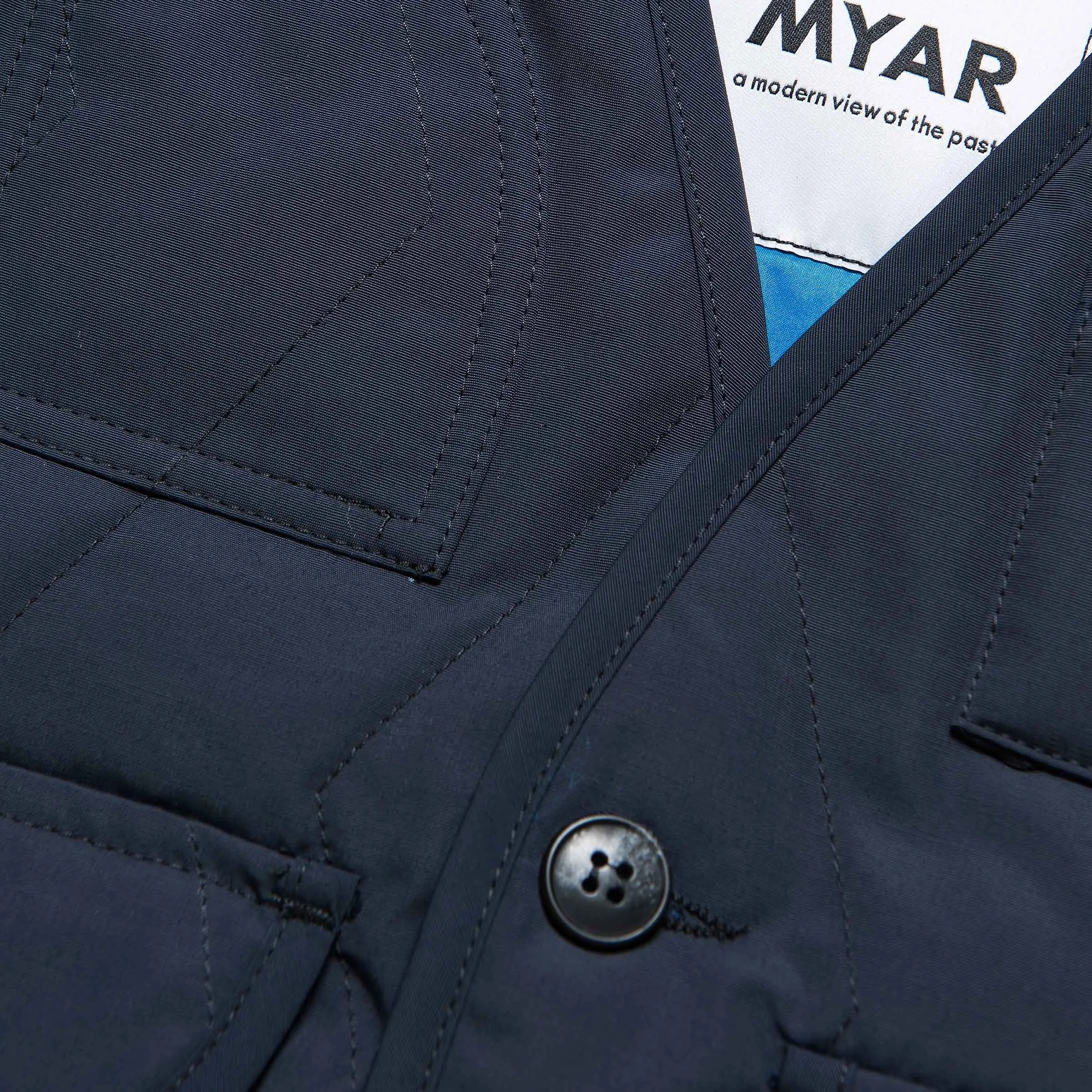 The waistcoat is inspired by that of the US airforce photographers, featuring multiple pockets and a loose fit. Made of quilted fabric with graphic pattern inspired by the inner lining of German Flecktarn Parka jackets.