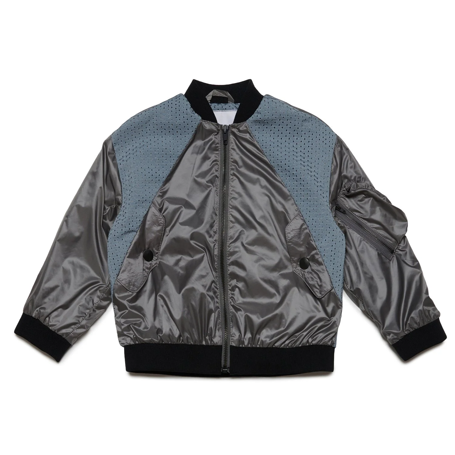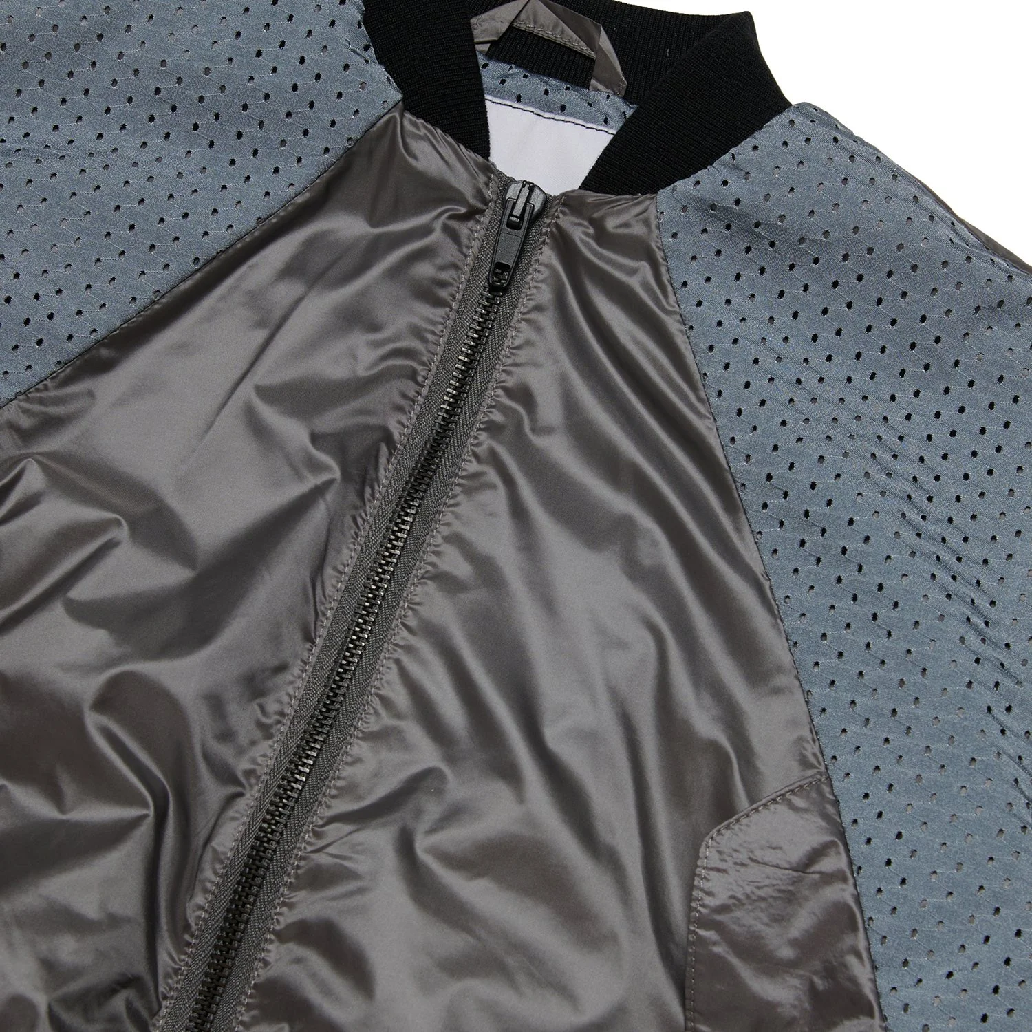 Bomber jacket made from deadstock nylon fabric, with tonal mesh inserts on the shoulders, mid-back and inside.