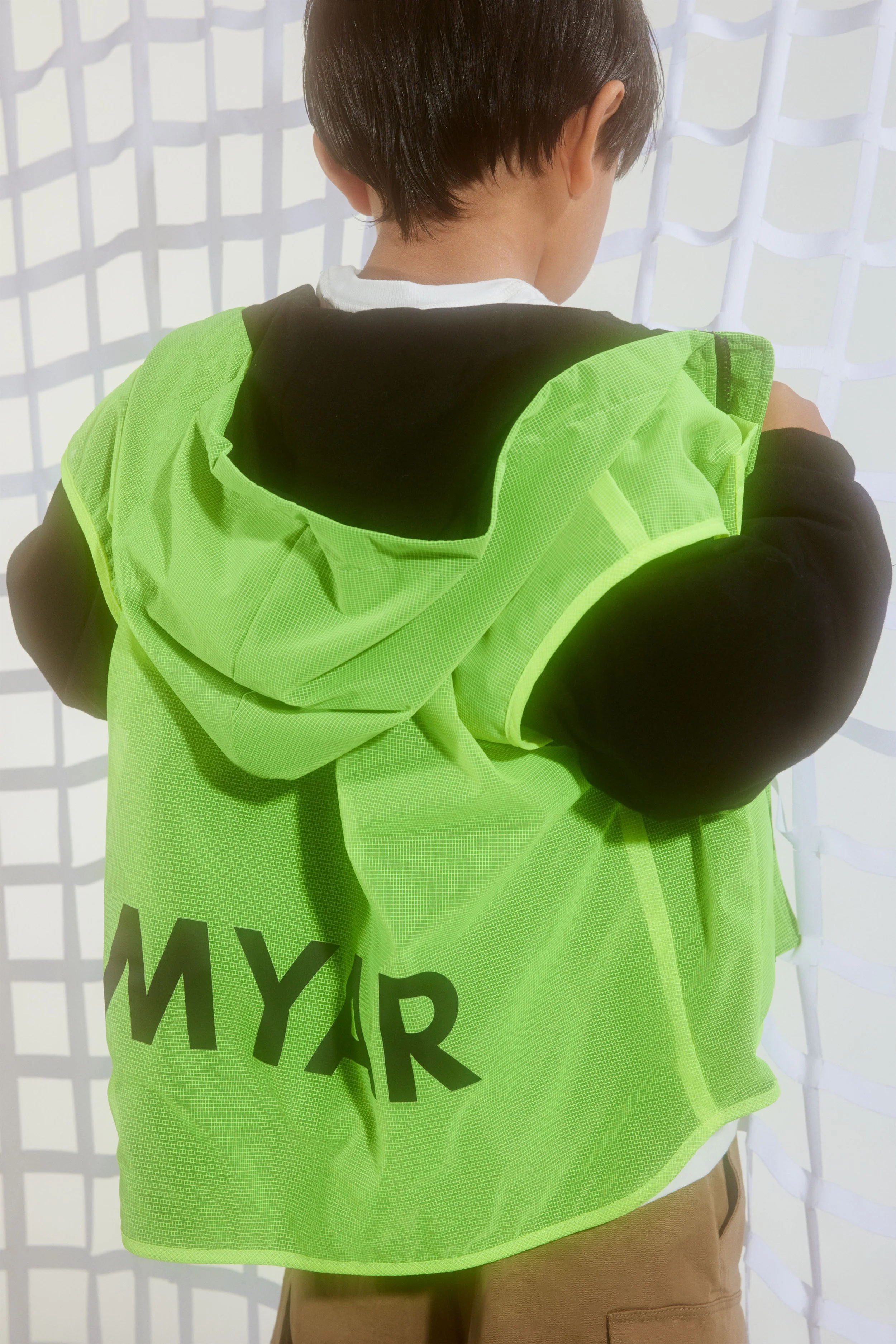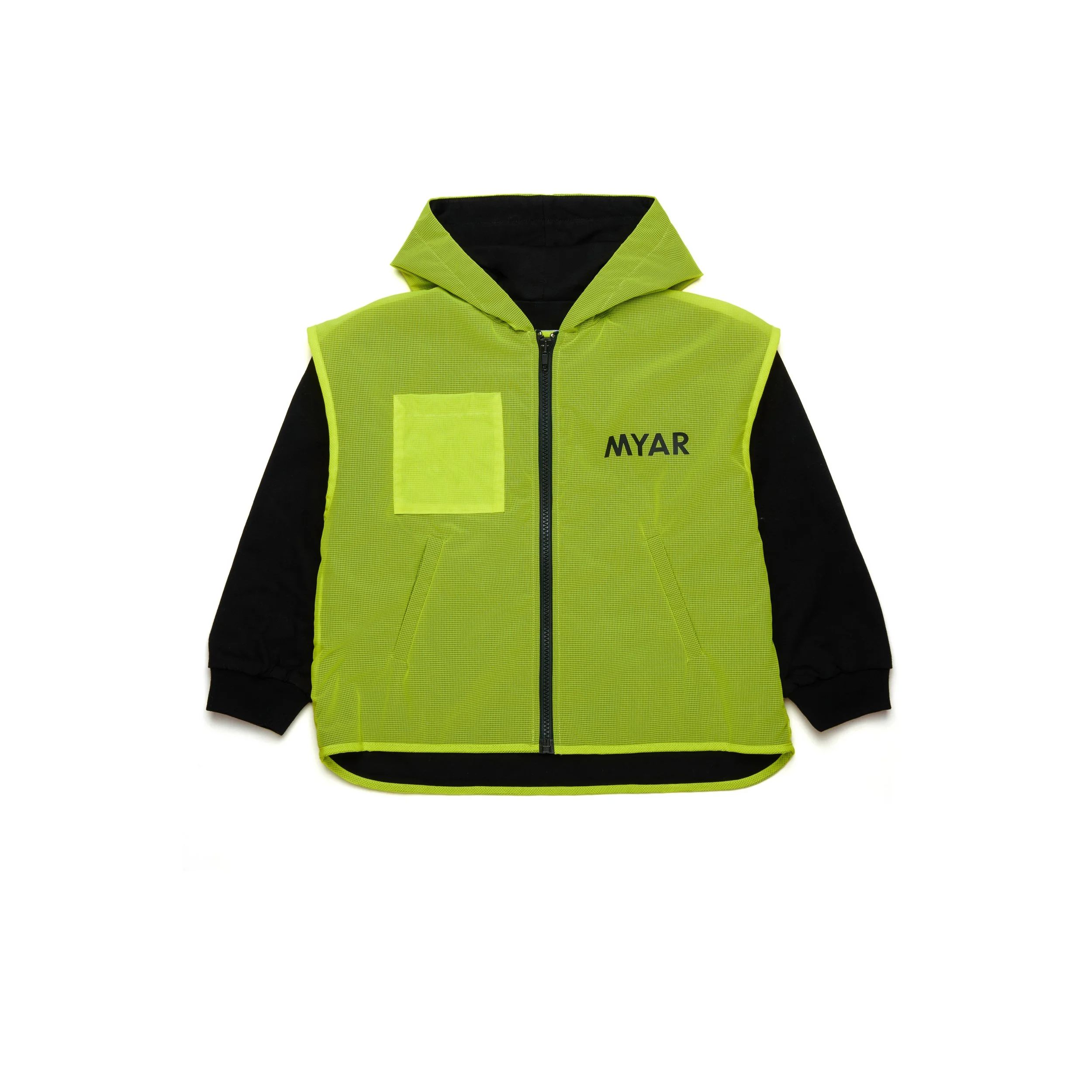 Hooded jacket made of double jersey and topped with flu yellow ripstop waistcoat.