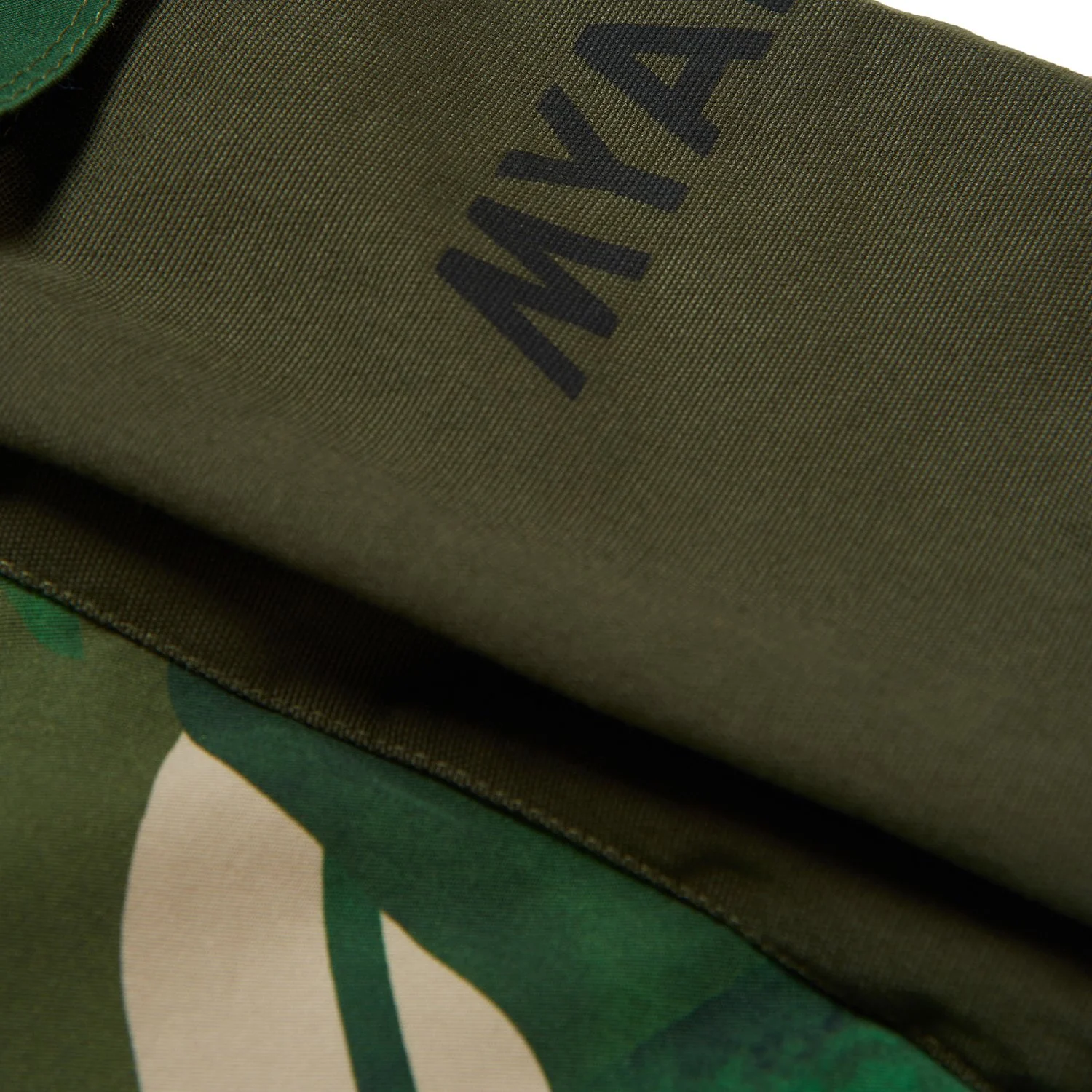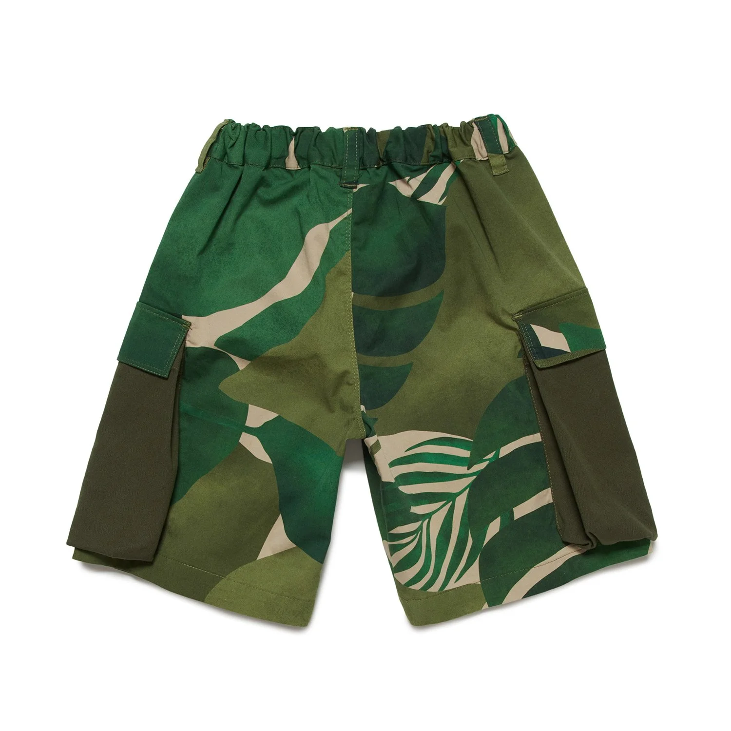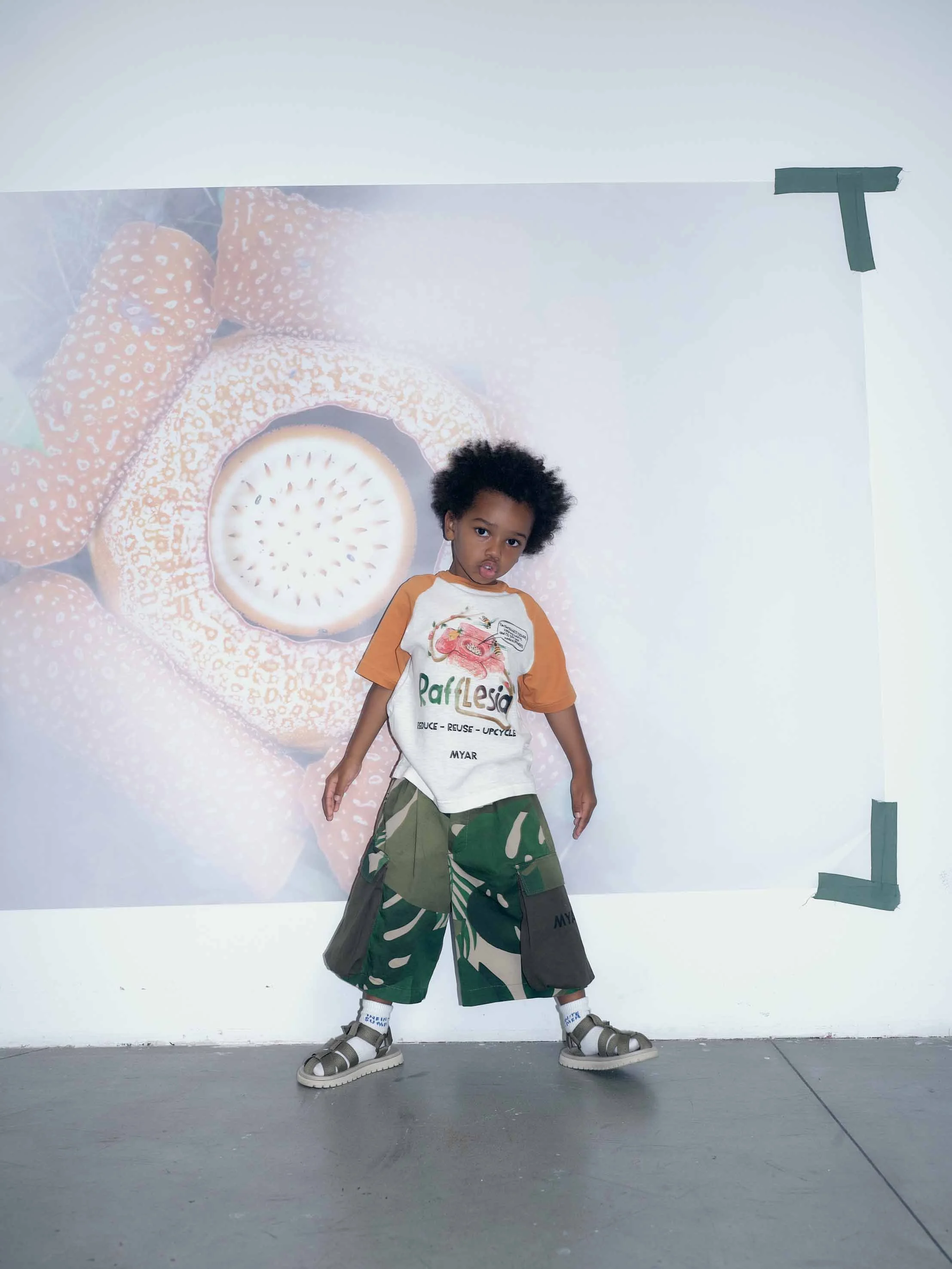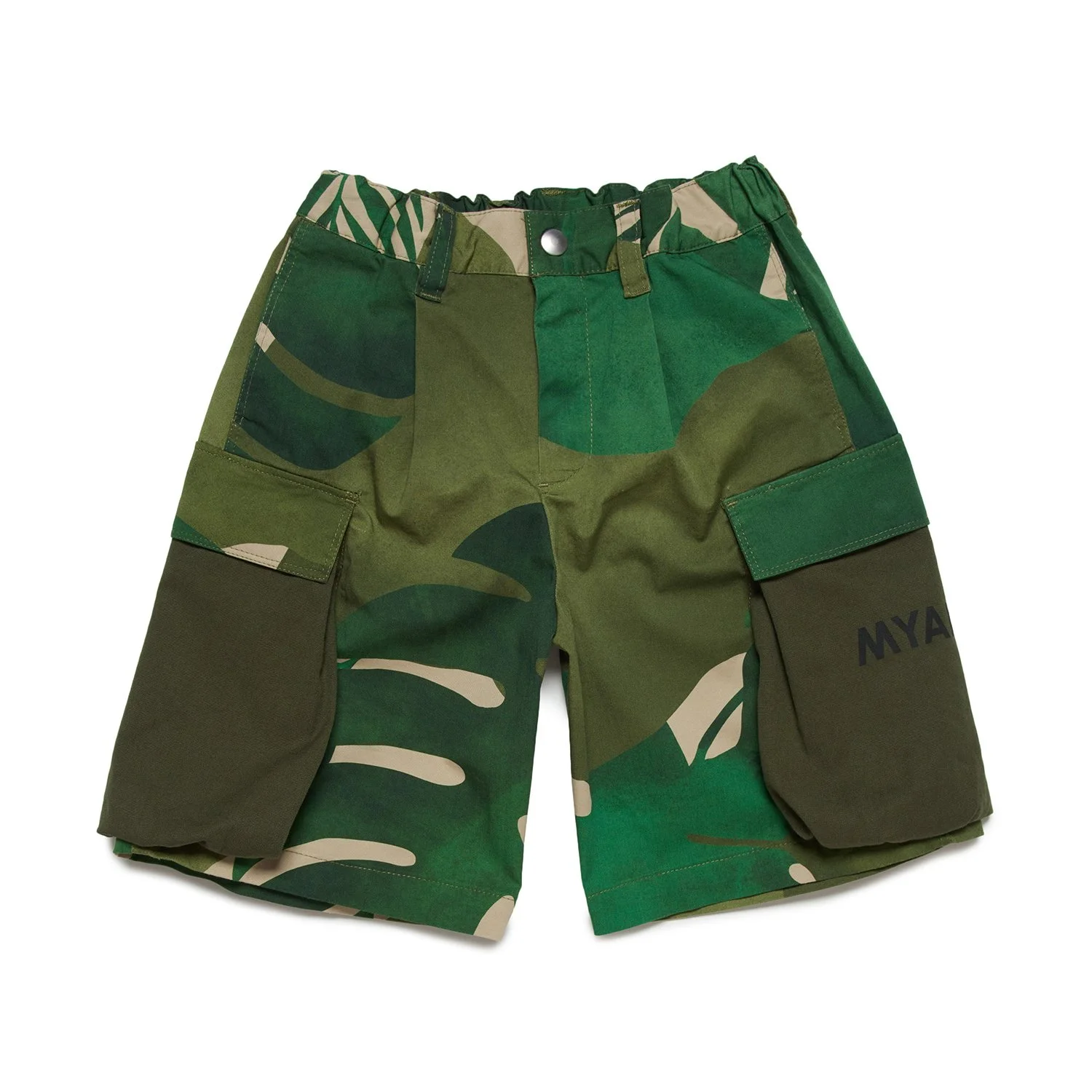 Two cargo pockets have been applied along the leg composed of alternating solid and printed fabric details. MYAR logo printed with bio-based water colour on the left pocket.