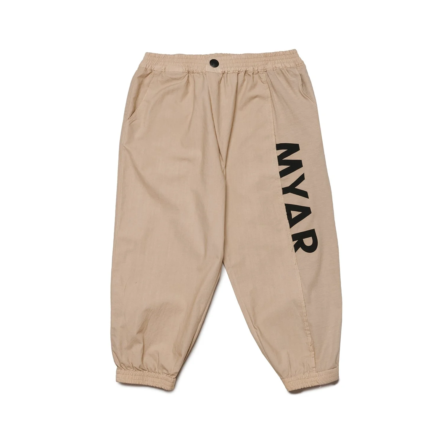 MYAR logo printed on the right leg in bio-based colours and inserted into the seam.