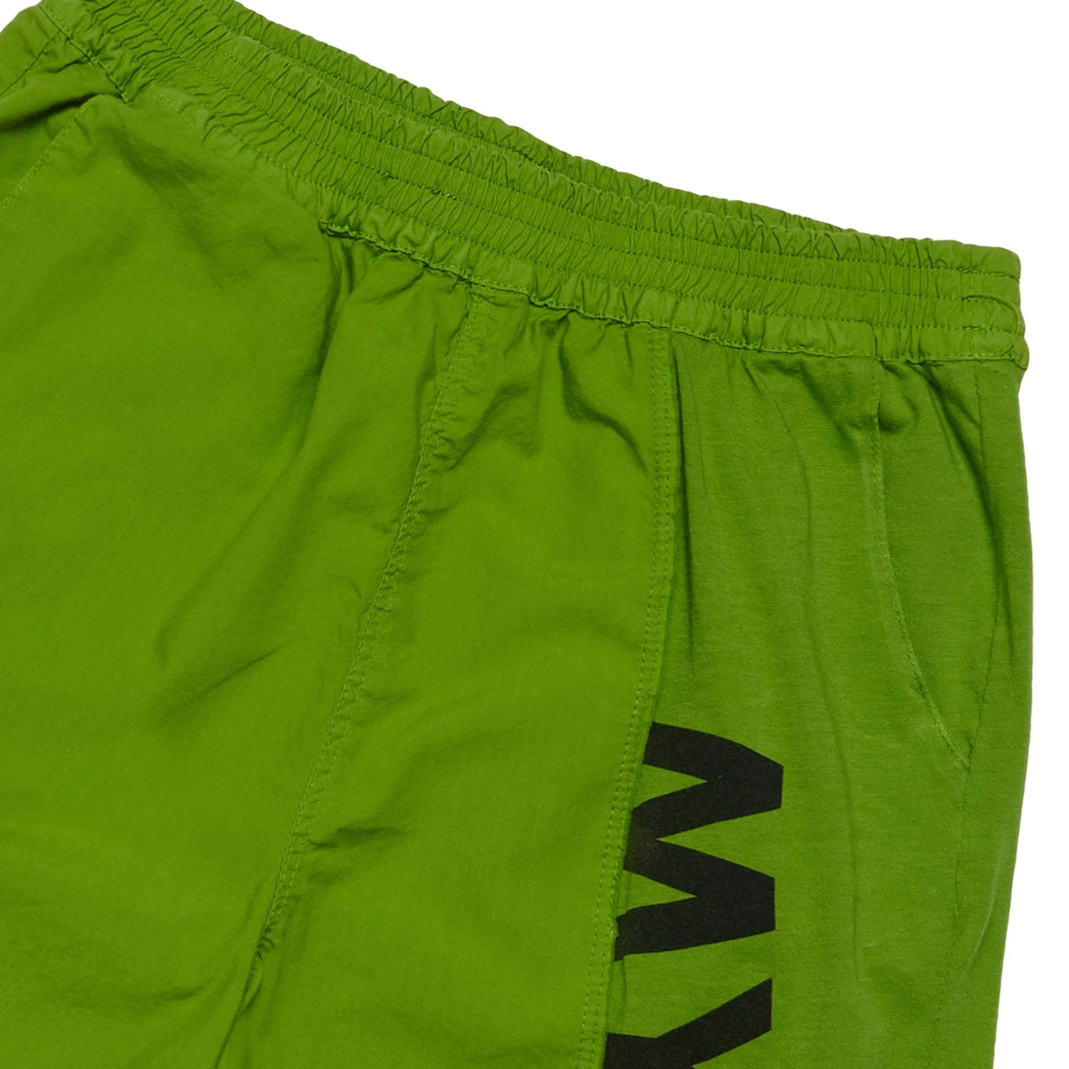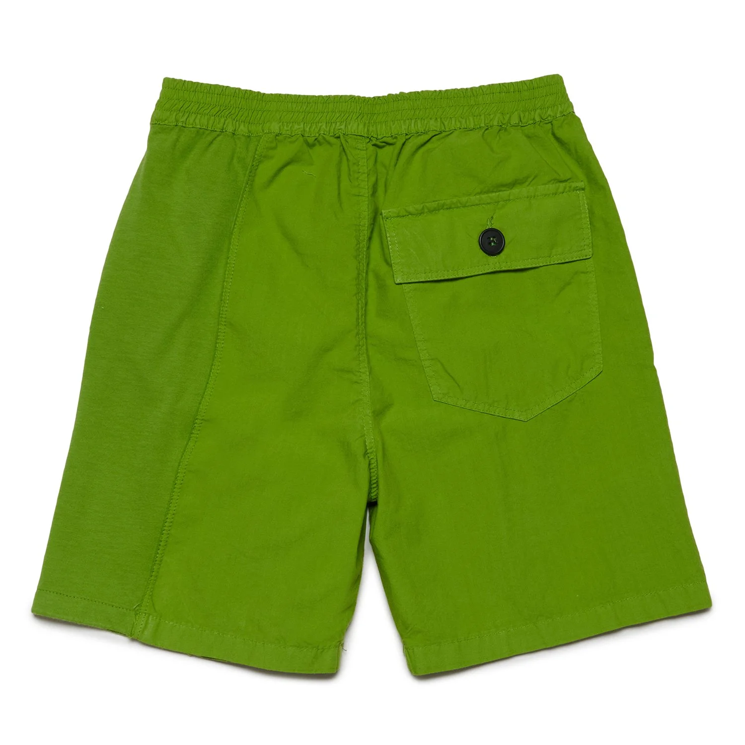 Garment-dyed shorts made from a patchwork of popelkine and jersey fabrics from deadstock. Elasticated waistband and patch flap pocket on the back.