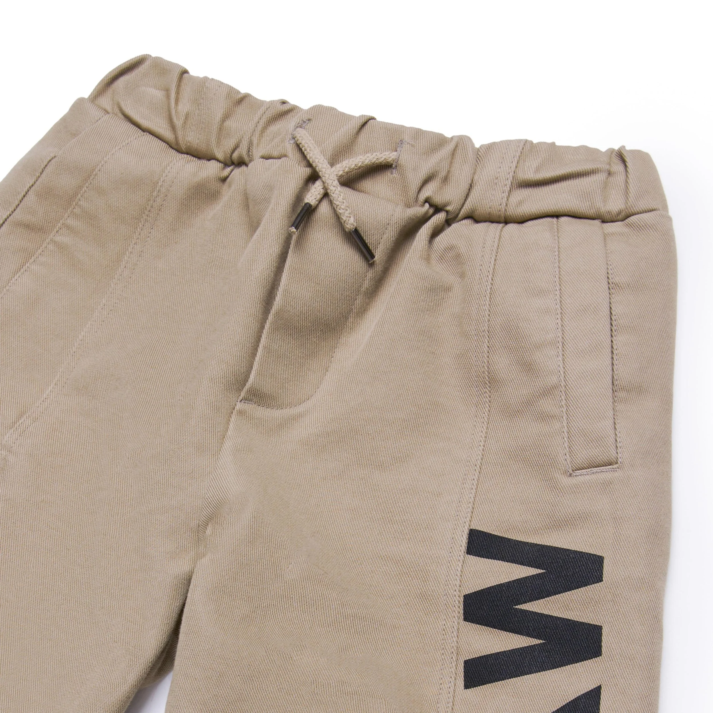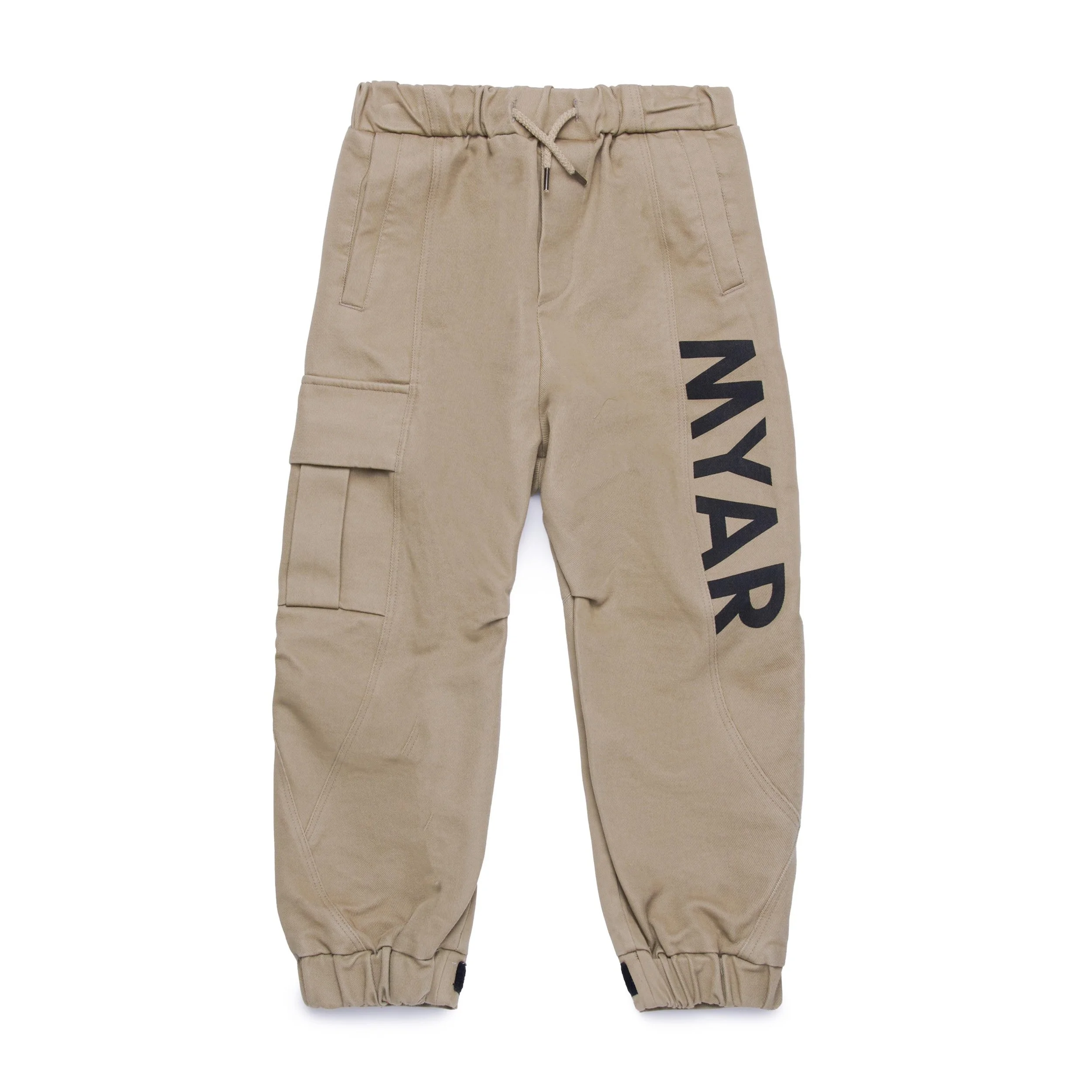 Pants inspired by the historic M65 model cargo pant, made of garbardine fabric from deadstock, with MYAR logo printed with bio-based ink and inserted cut into the left leg seam. Cargo patch pocket on right leg.