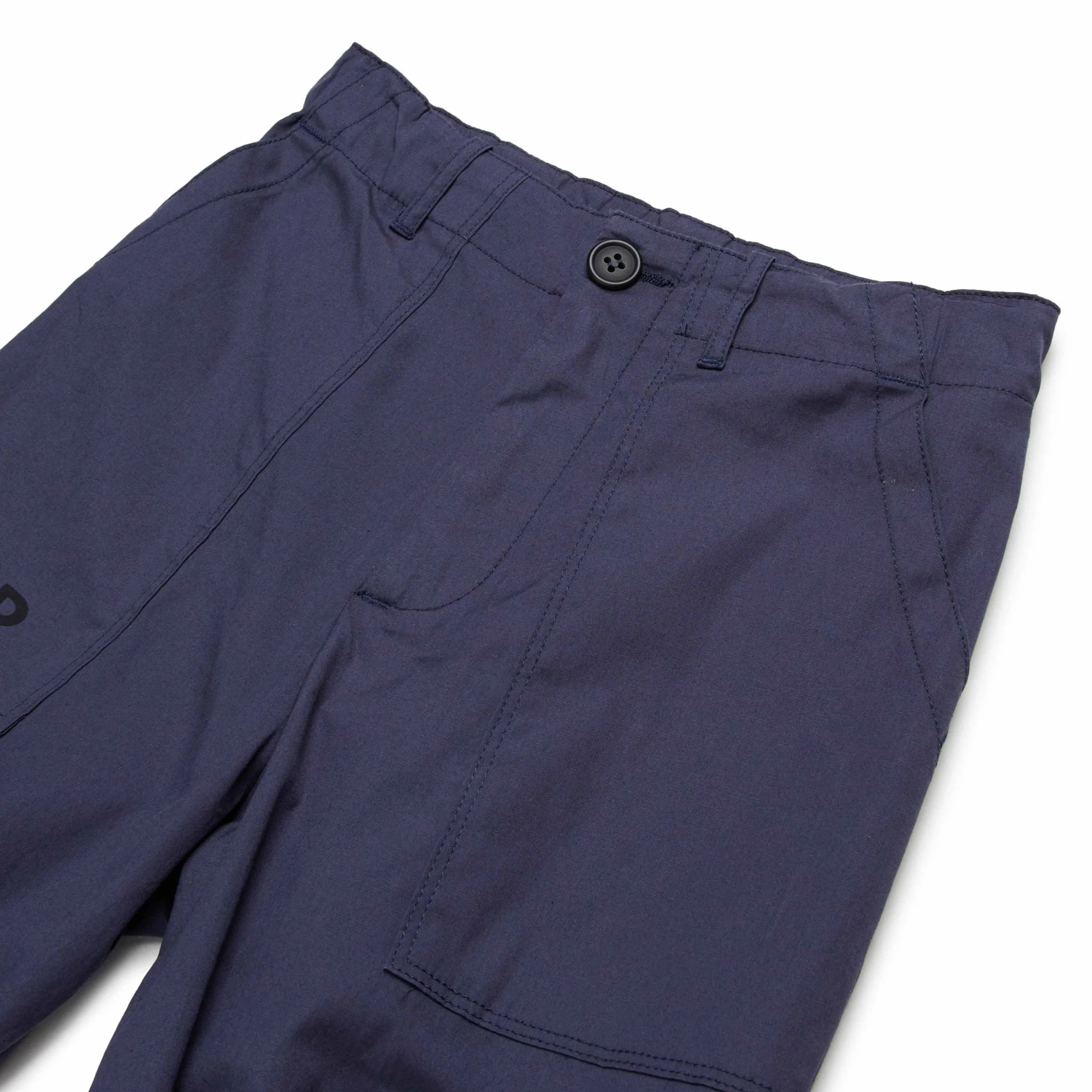 Gathered leg bottoms with woven elastic, patch pockets on the front and back pocket with flap closure.