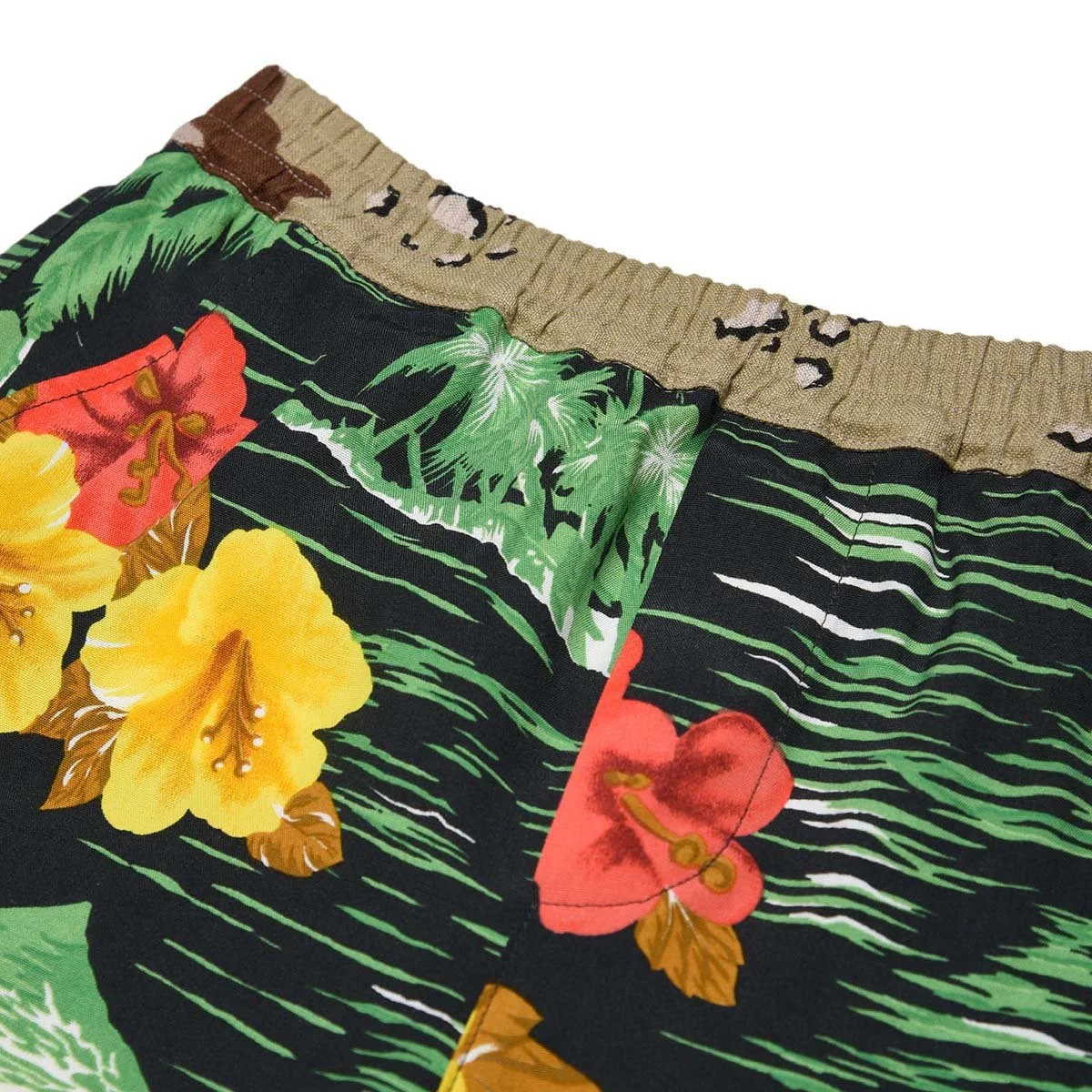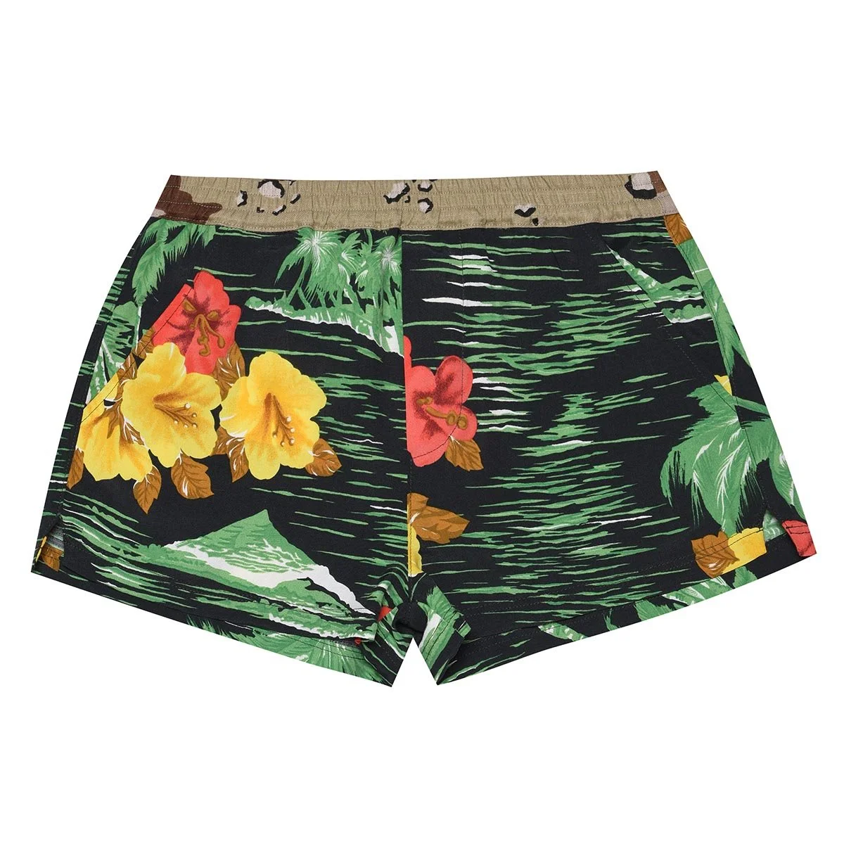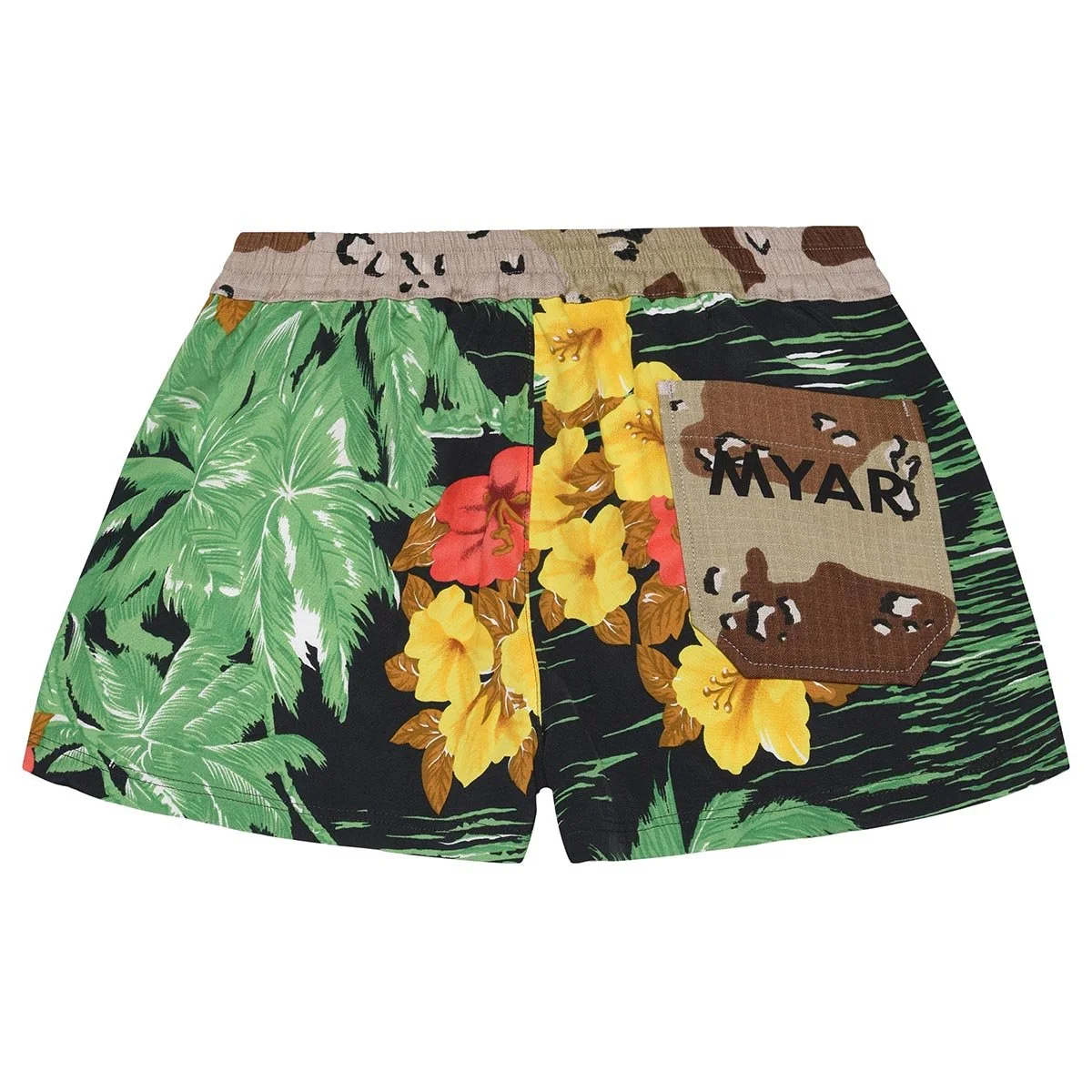 Hawaiian style shorts made from deadstock Hawaiian patterned fabric. Contrasting desert camouflage fabric from deadstock for the waistband and back pocket. MAYR logo pocket print made using a water print with bio-based colour .