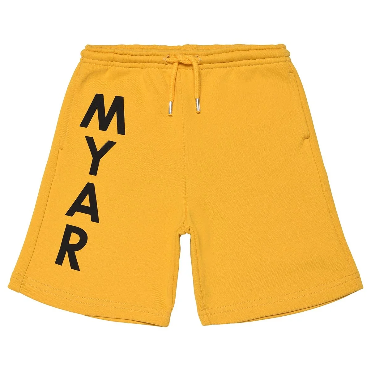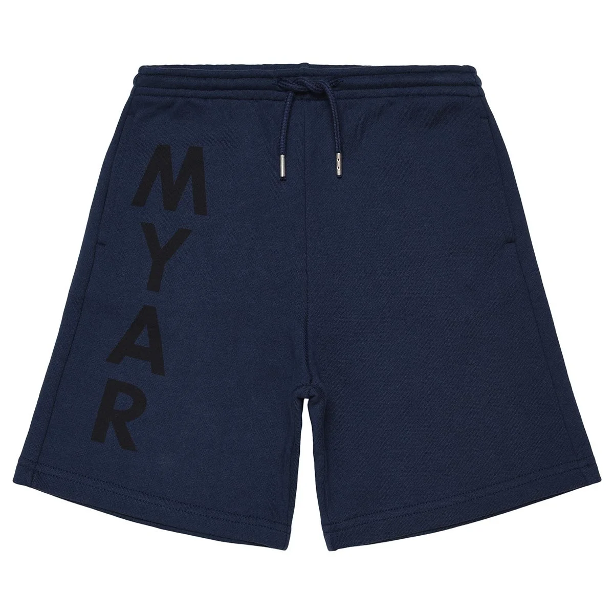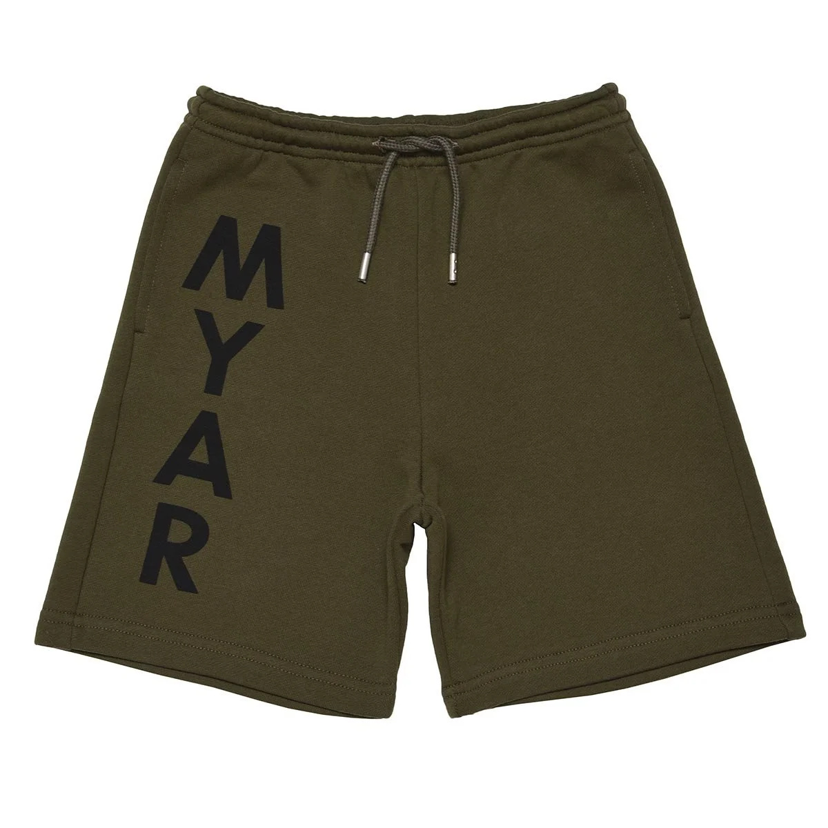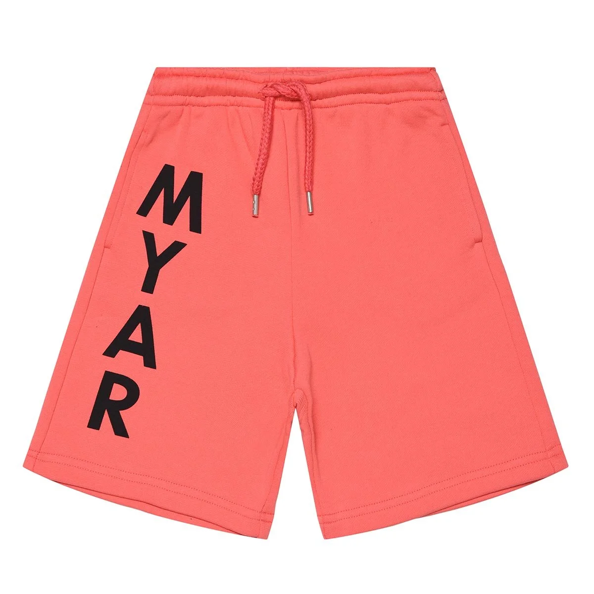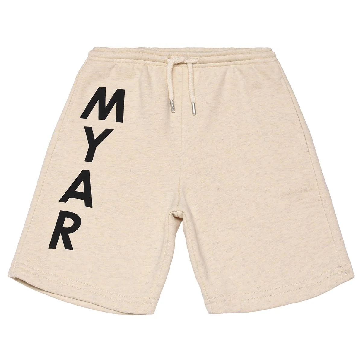 Shorts made from deadstock fleece with a vertical MYAR logo print made using a water print with bio-based colour down the right leg.