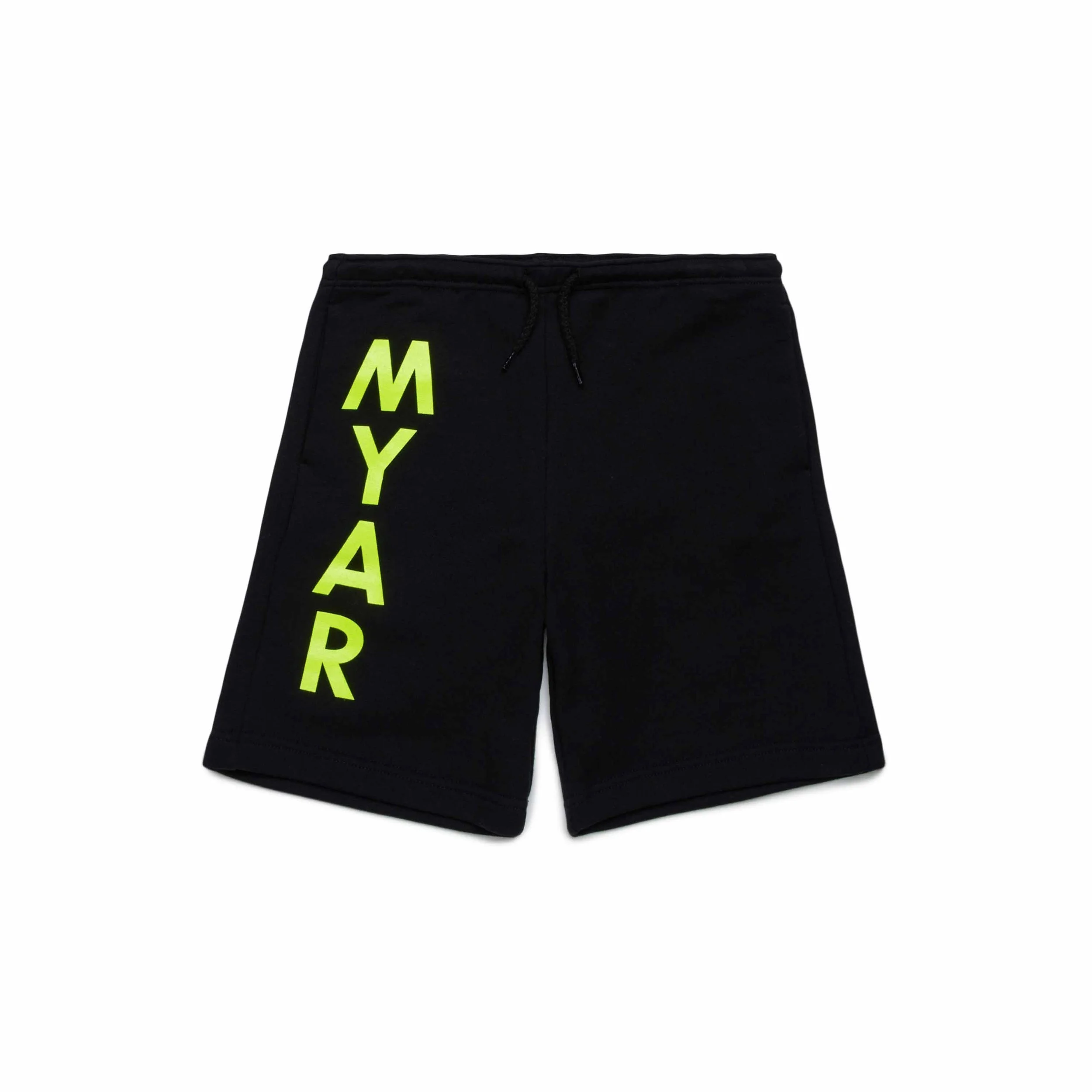 Sweatshort made from deadstock fleece fabric, with vertical MYAR logo printed along the right leg.