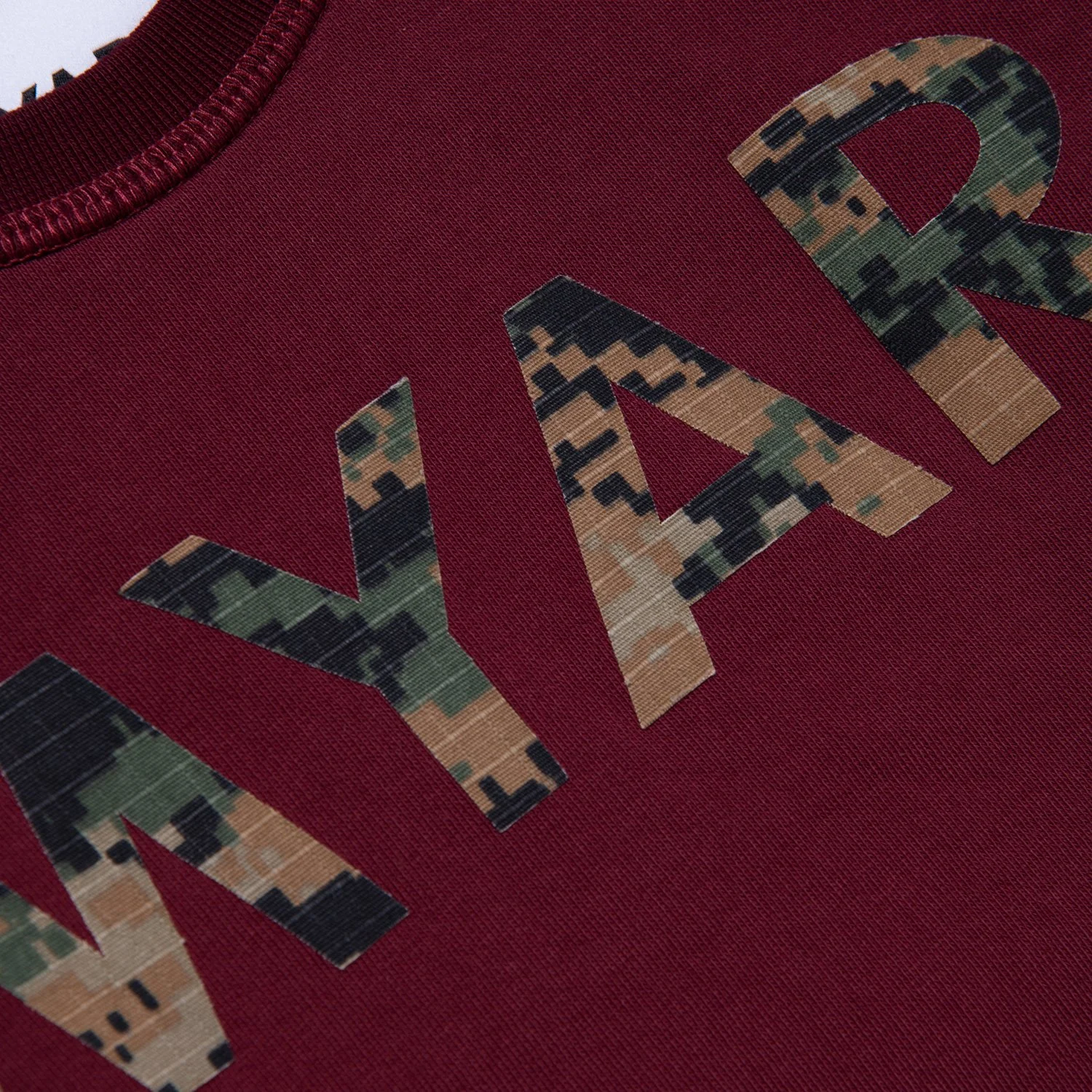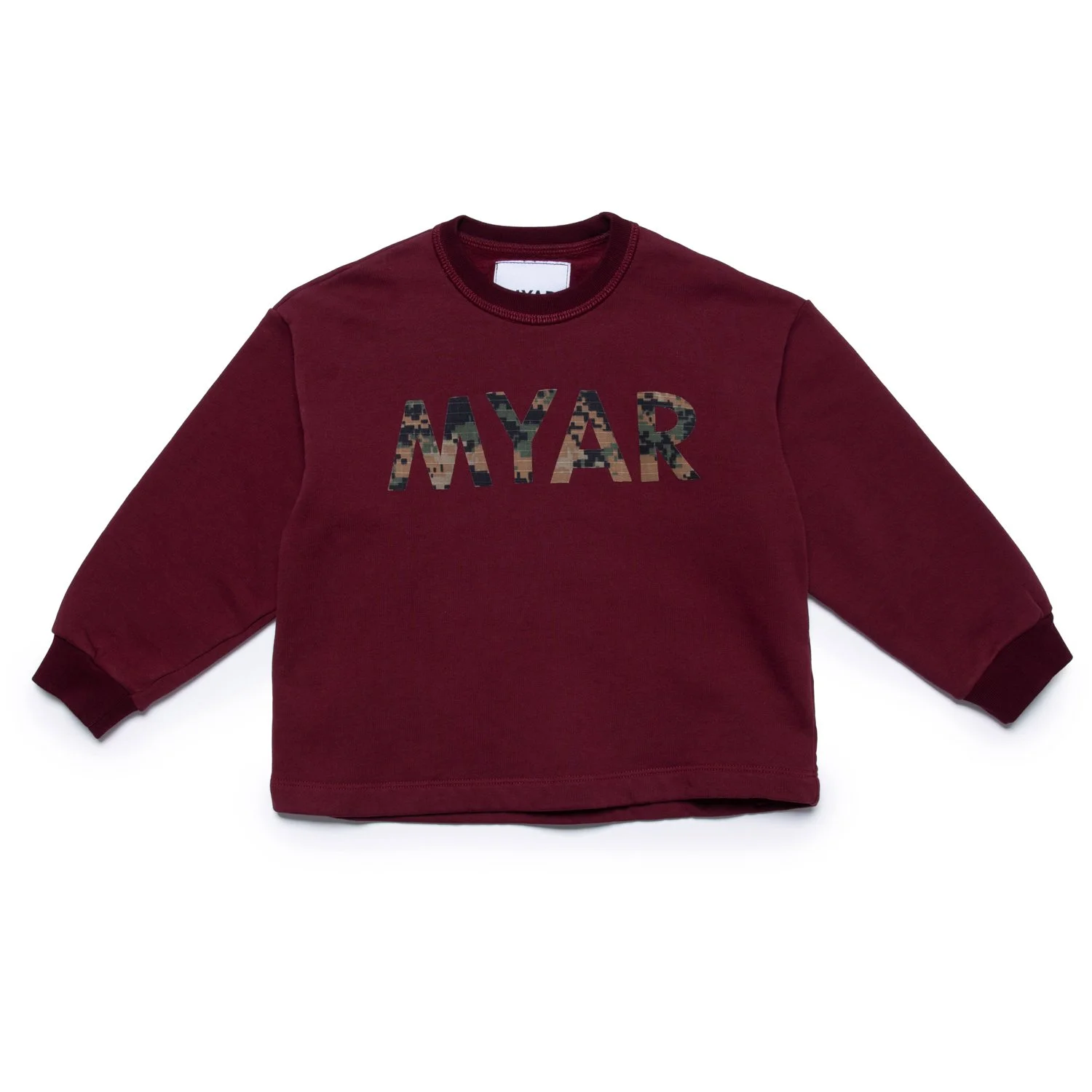 Crewneck sweatshirt made from deadstock fabric, with lasered MYAR Logo made of camou pixel fabric and applied on the chest.