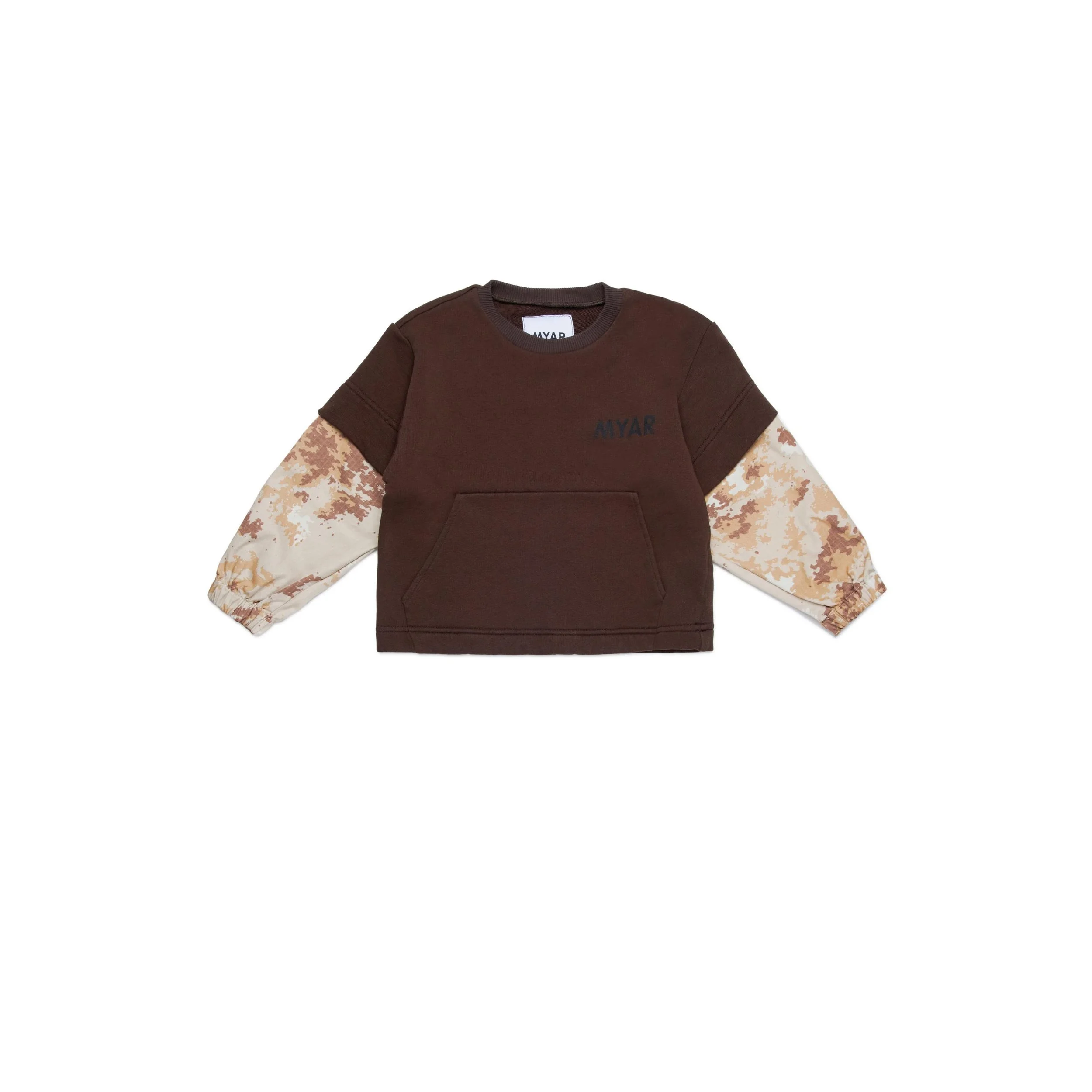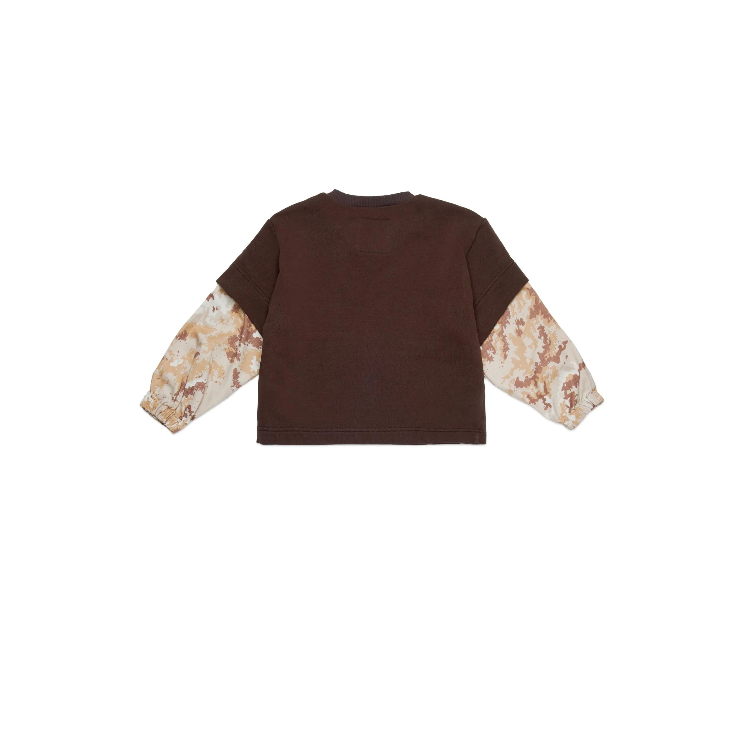 Short sleeve crewneck sweatshirt with inserted sleeves in pixel camouflage fabric from deadstock.