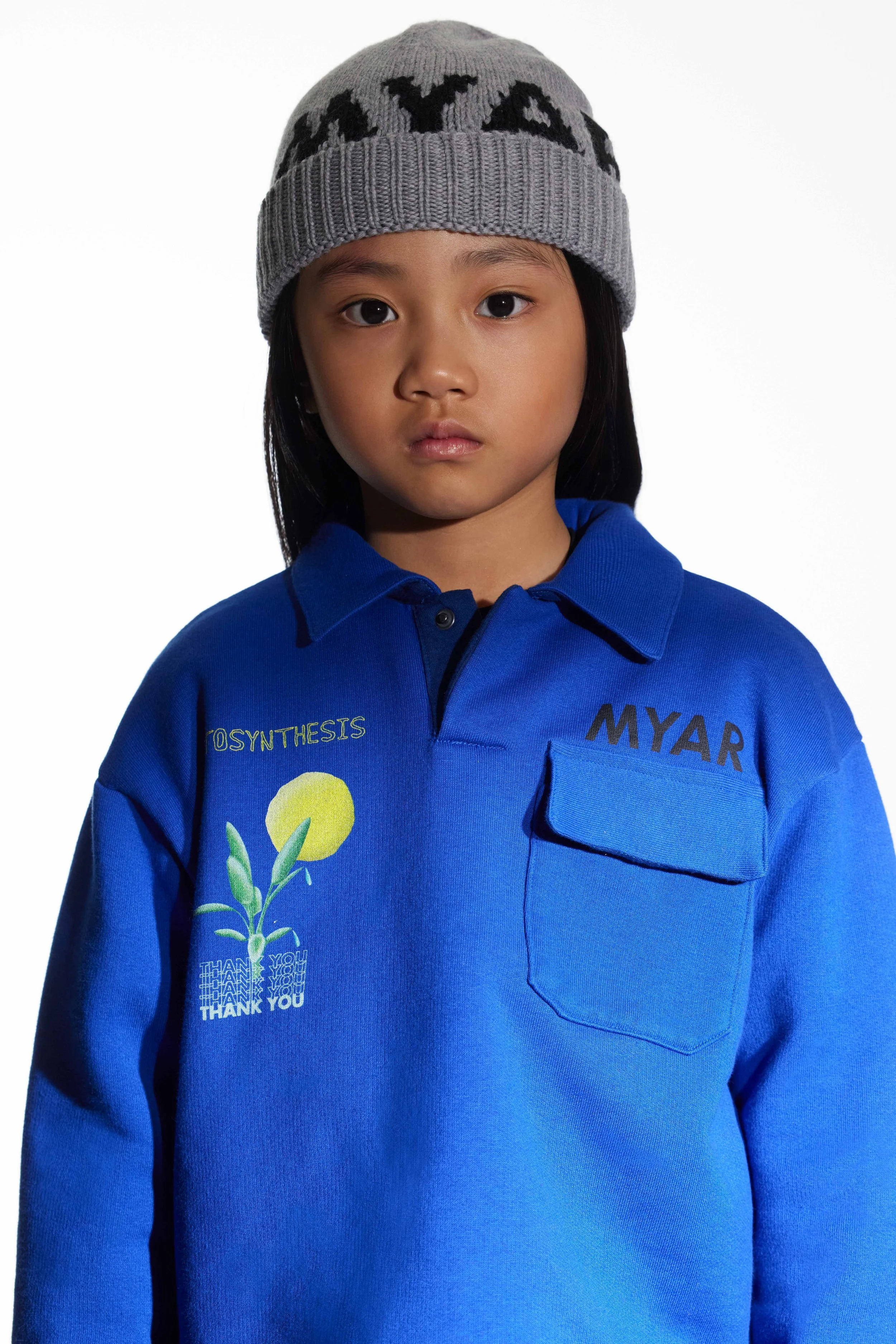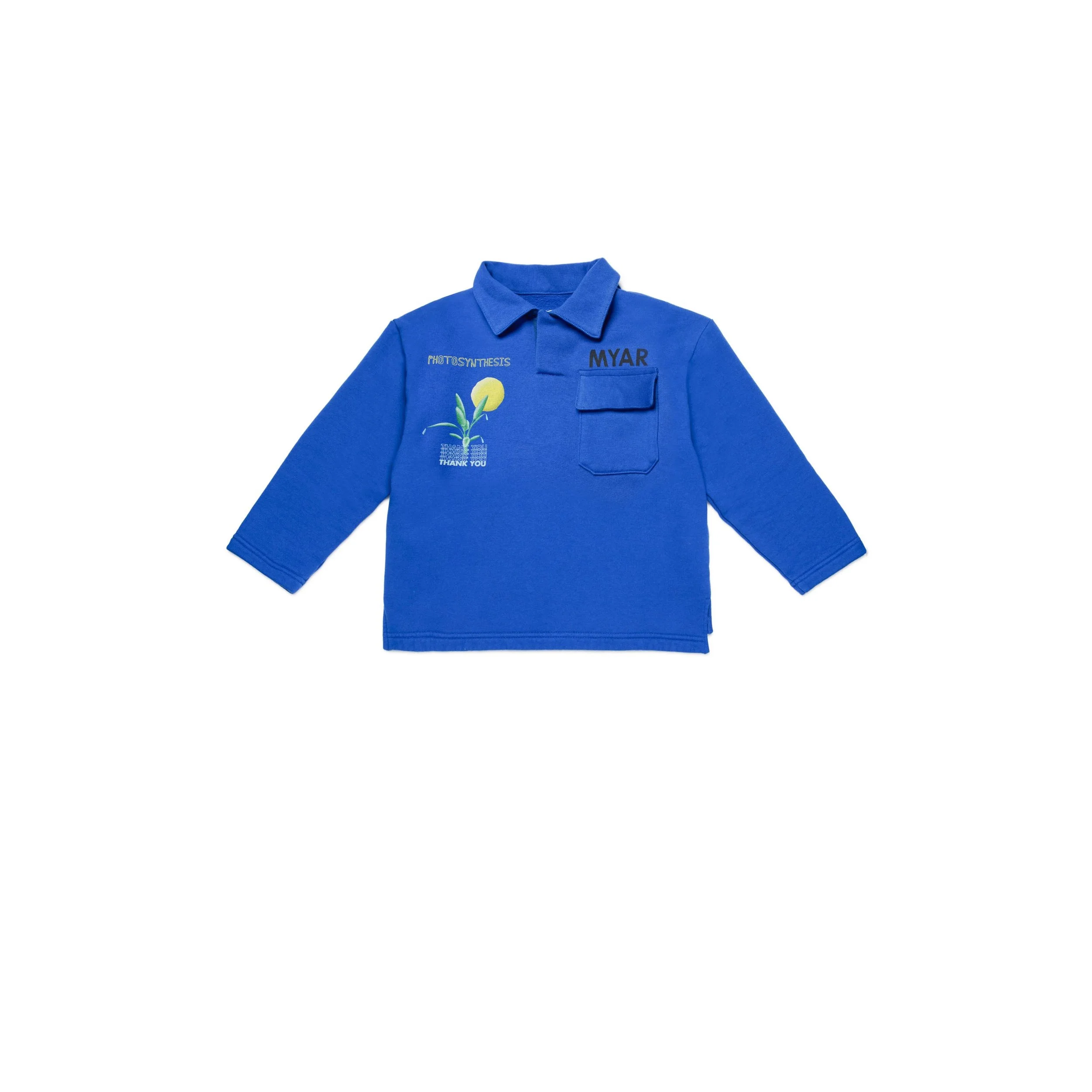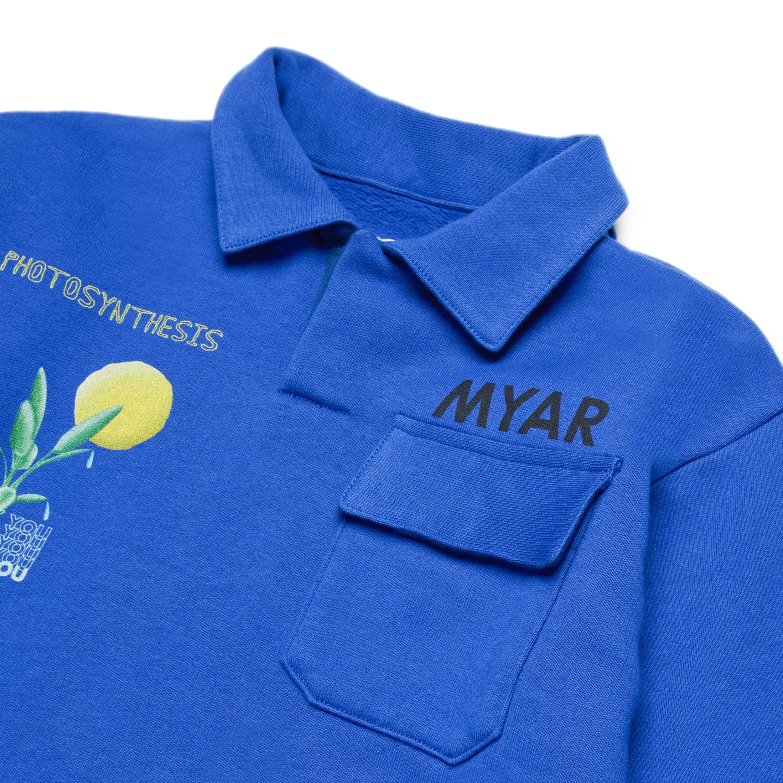 Shirt collar sweatshirt made from deadstock fabric, with placed print of Photosynthesis / yes, thank you!! graphic on the front left side, made by screen printing transfer.
