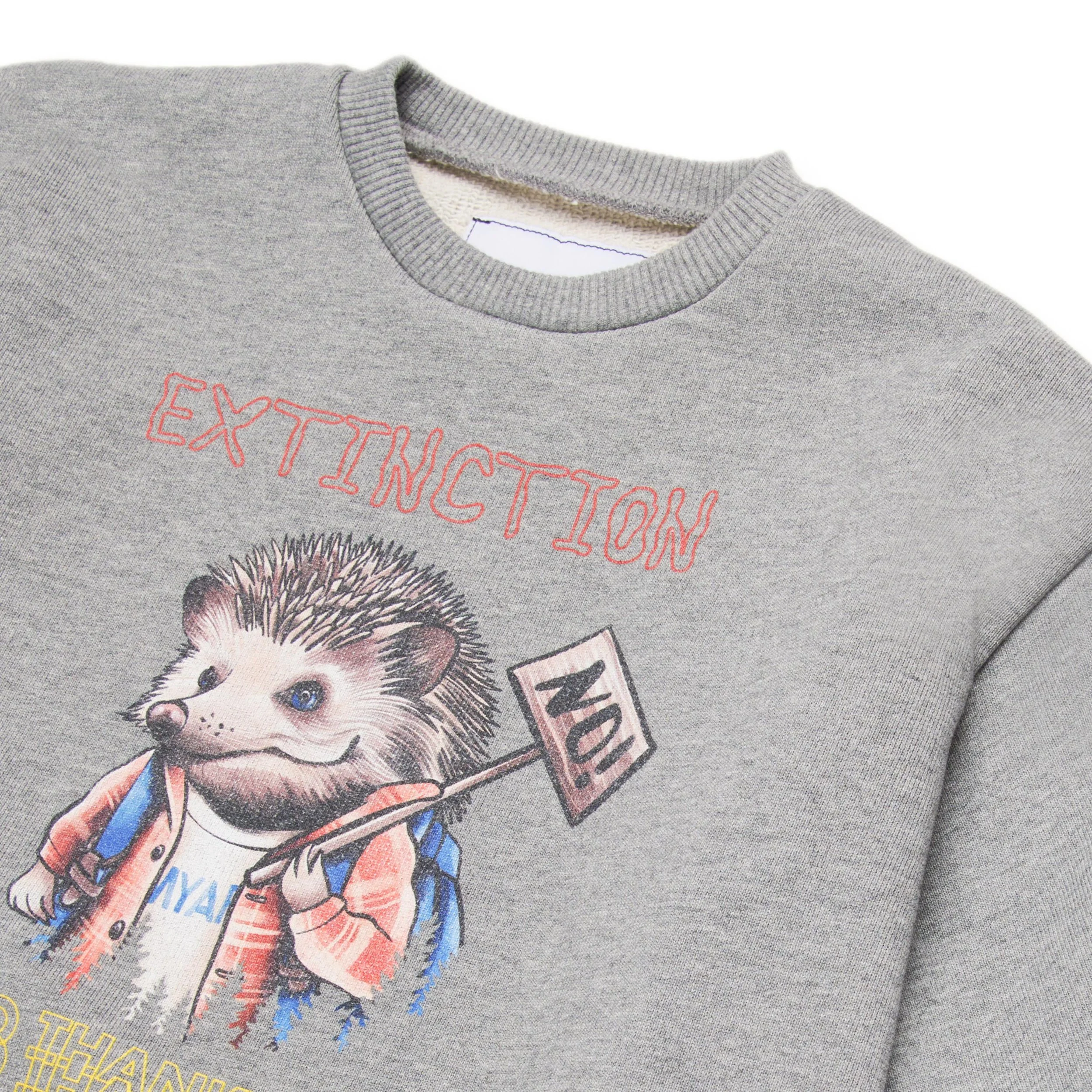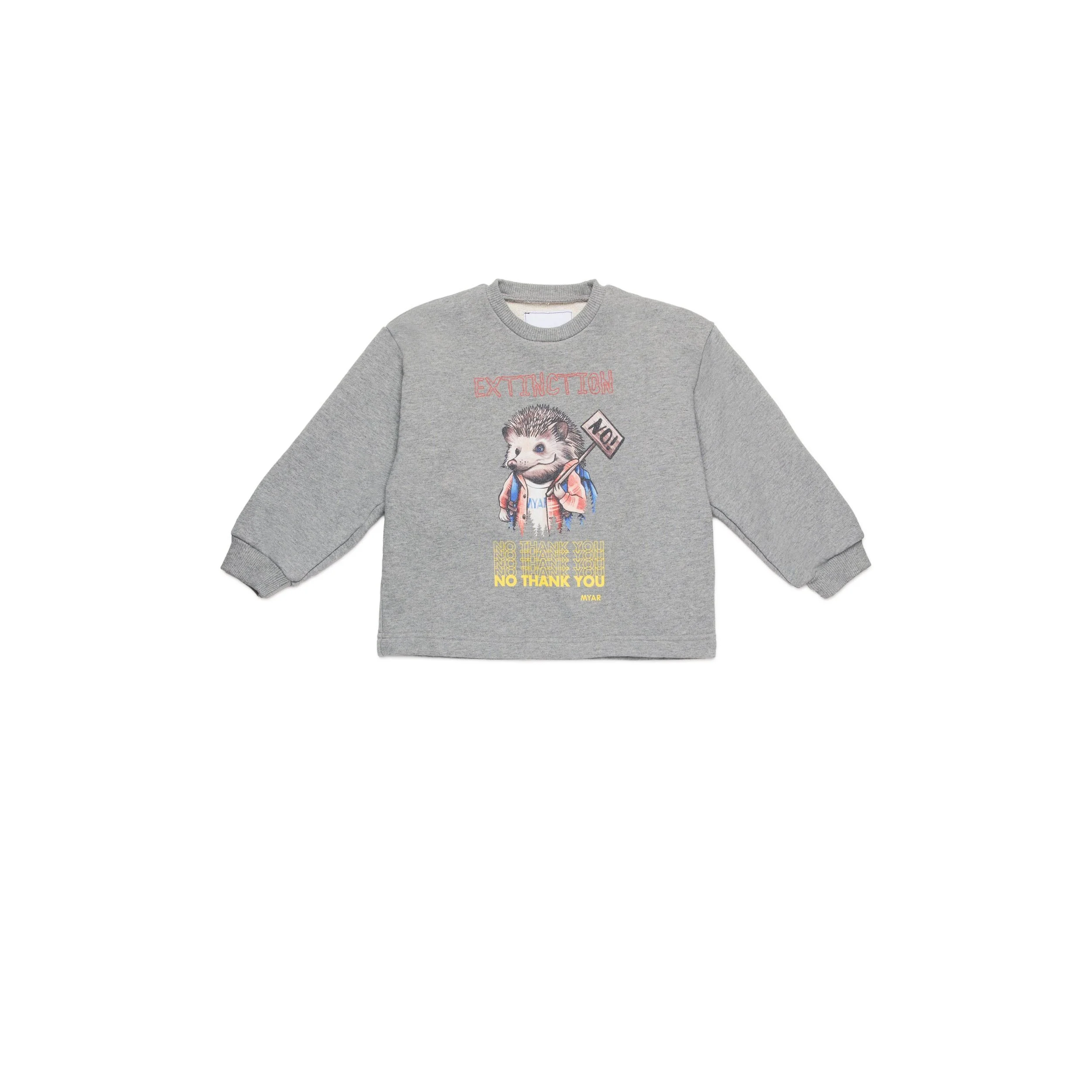 Crewneck sweatshirt made from deadstock fabric, with Extinction / no, thank you! graphic made by screen printing transfer.