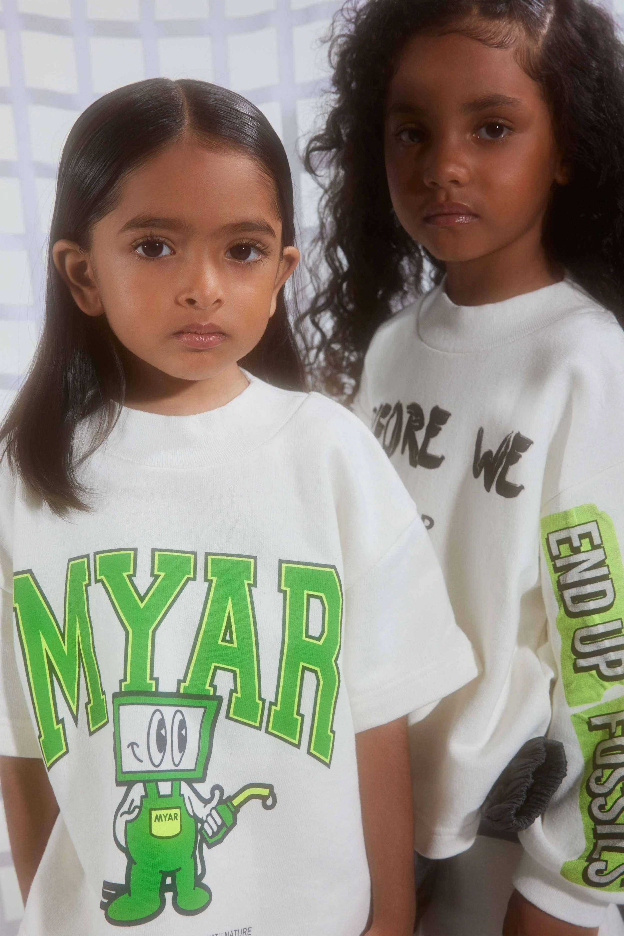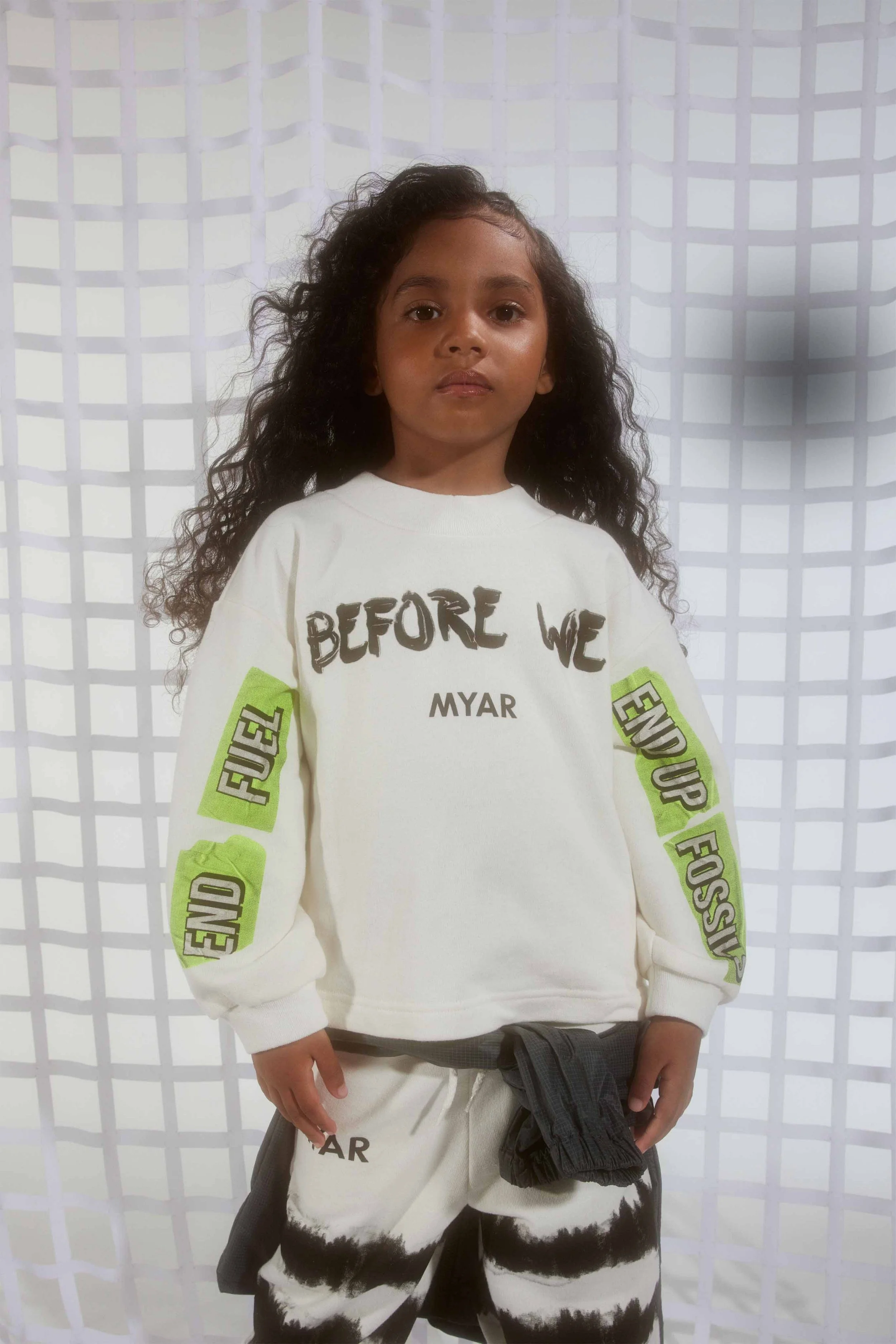Screen-printed Before We graphic is arranged on the front and along the arms so that the message on the print hugs the child's body.