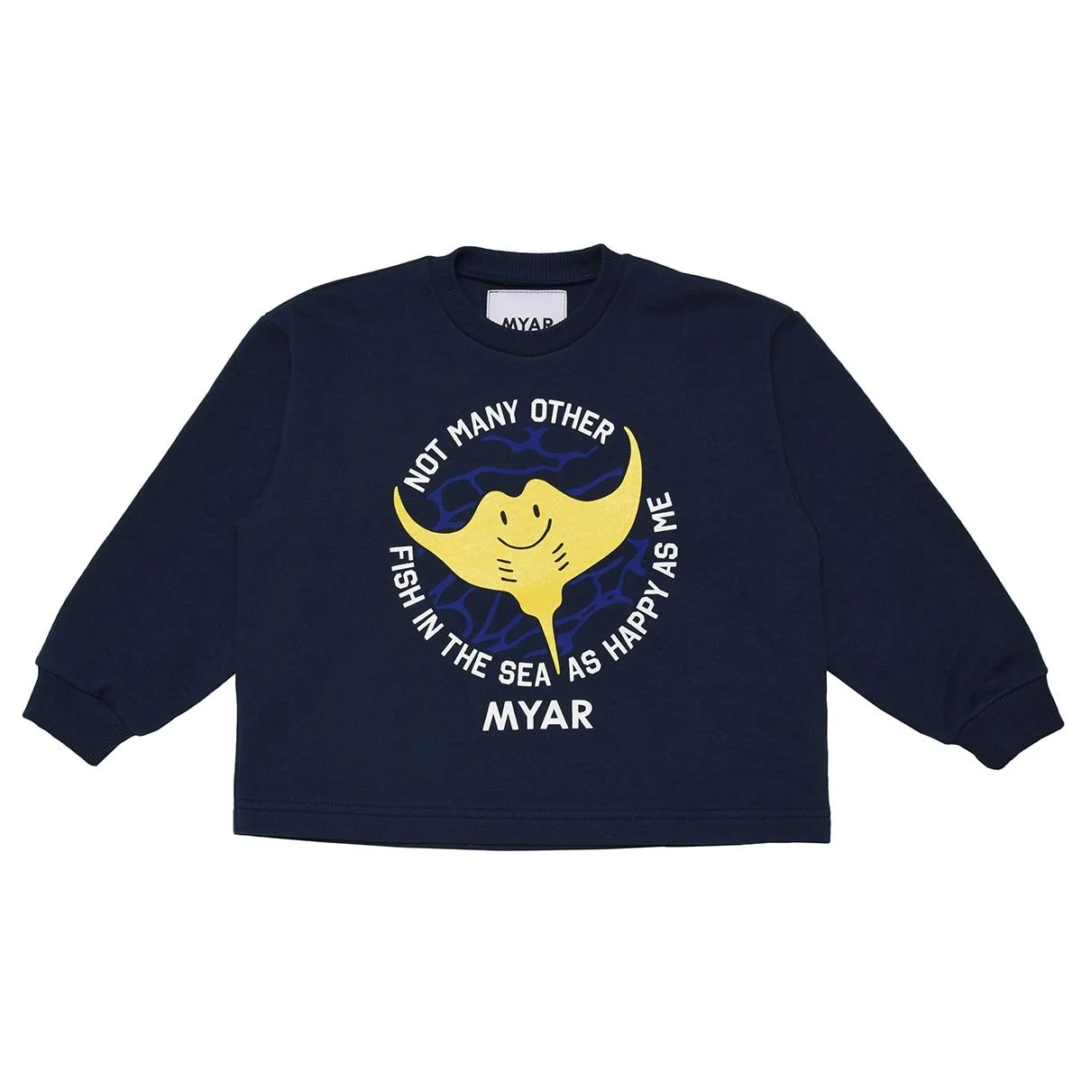 On the chest a water print with bio-based colour with the words NOT MANY OTHER FISH IN THE SEA AS HAPPY AS ME (MANTA RAY) which bears witness to MYAR’s commitment to raising awareness in adults and children about the importance of keeping our waters clean and showing the consequences of our actions on living creatures.
