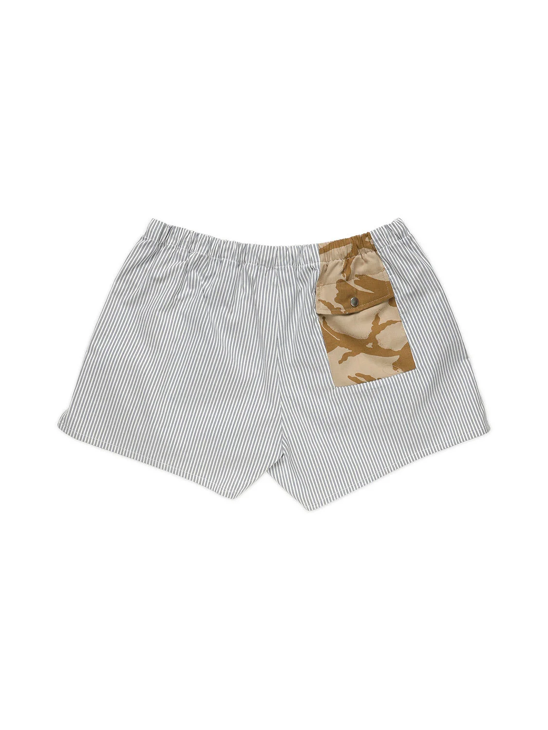 Shorts made with classic striped deadstock fabric onto which has been applied a pocket on the back in English desert camouflage fabric, recovered from scraps from other garments in our collections.
