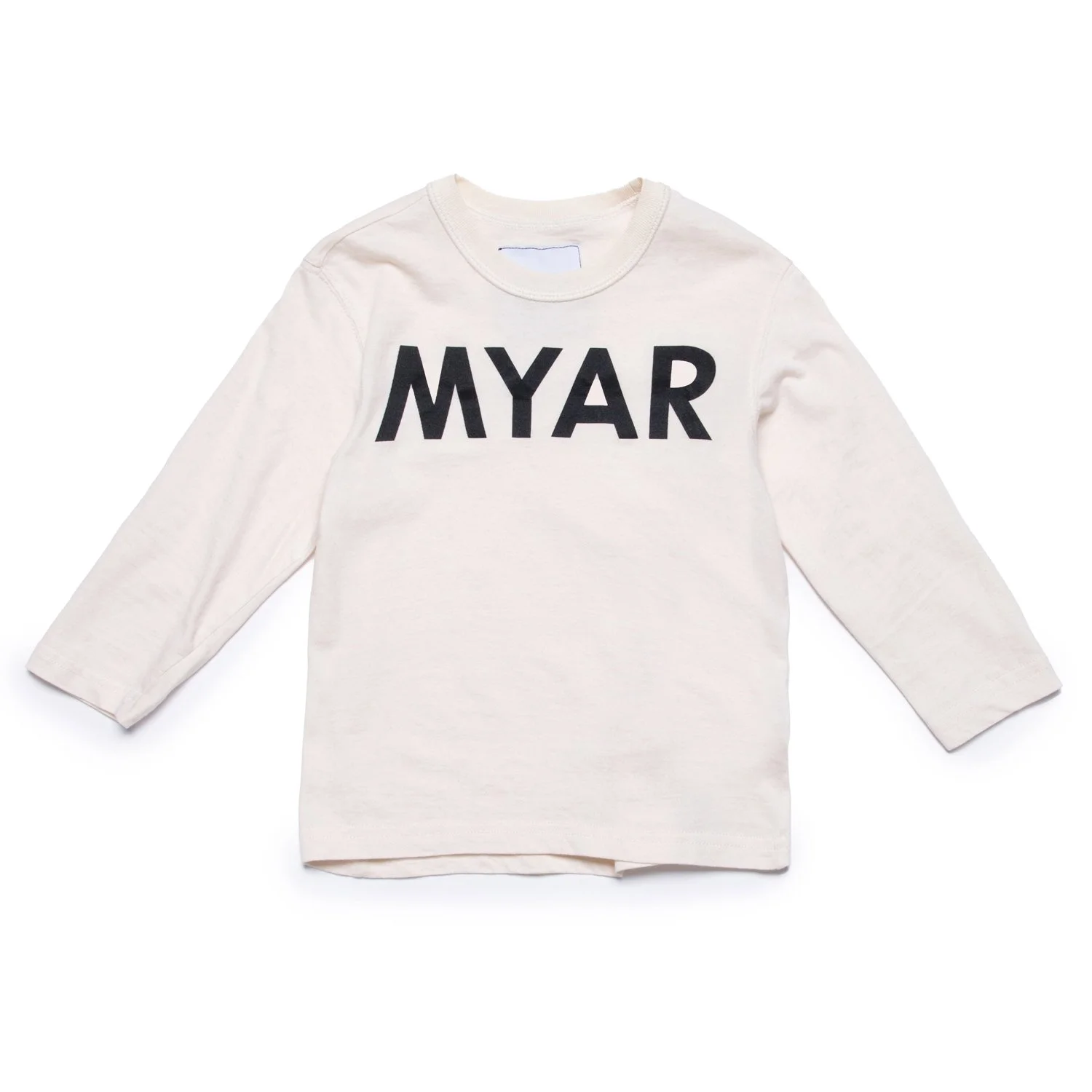 Cotton long-sleeve T-shirt made from deadstock fabric. MYAR logo printed on the chest with a bio-based water-based color.