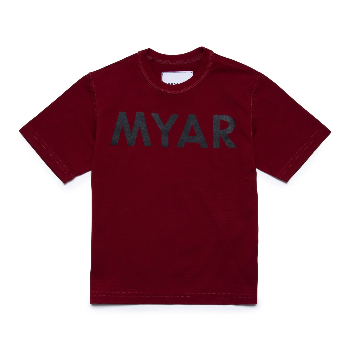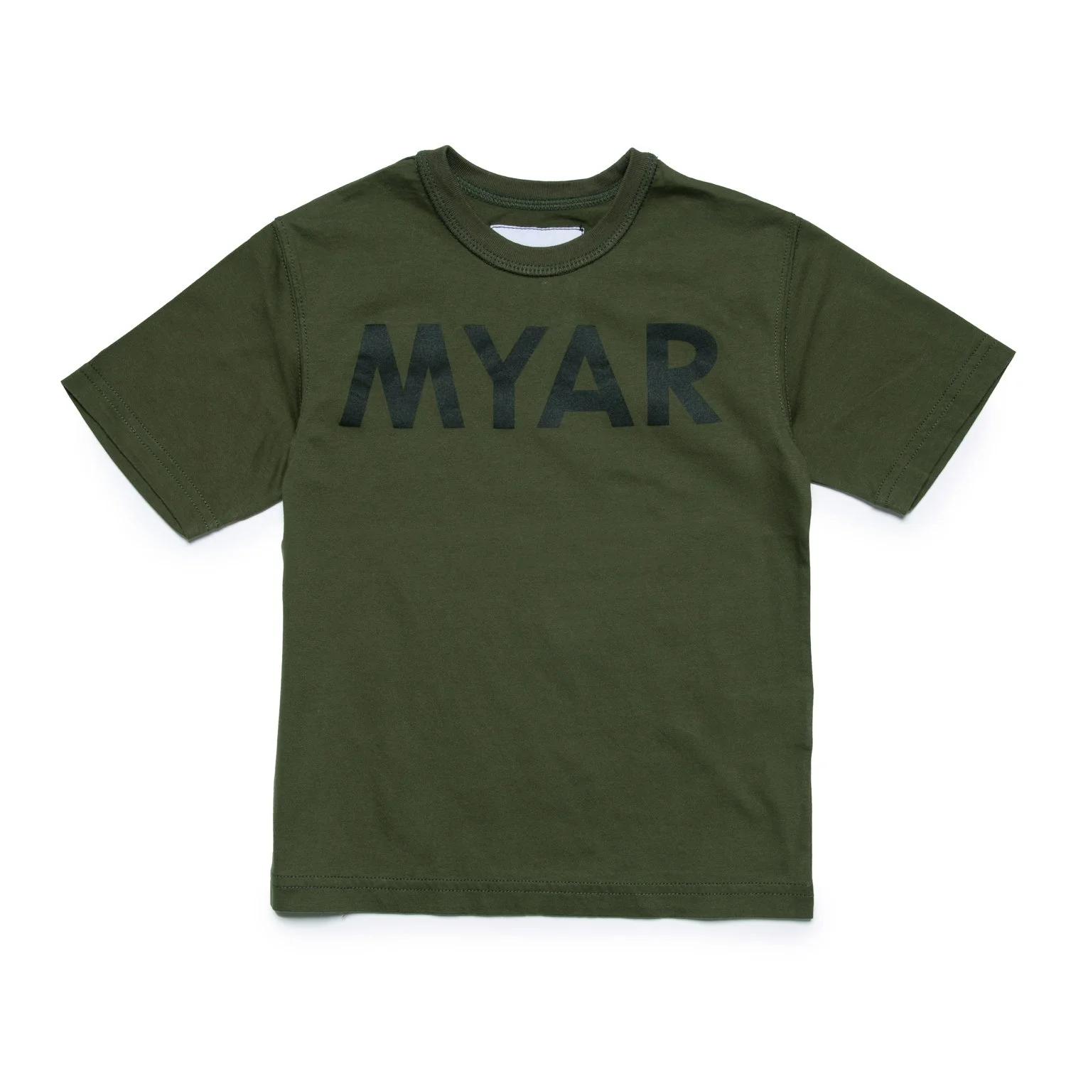 Cotton T-shirt made from deadstock fabric. MYAR logo printed on the chest with a bio-based water color.