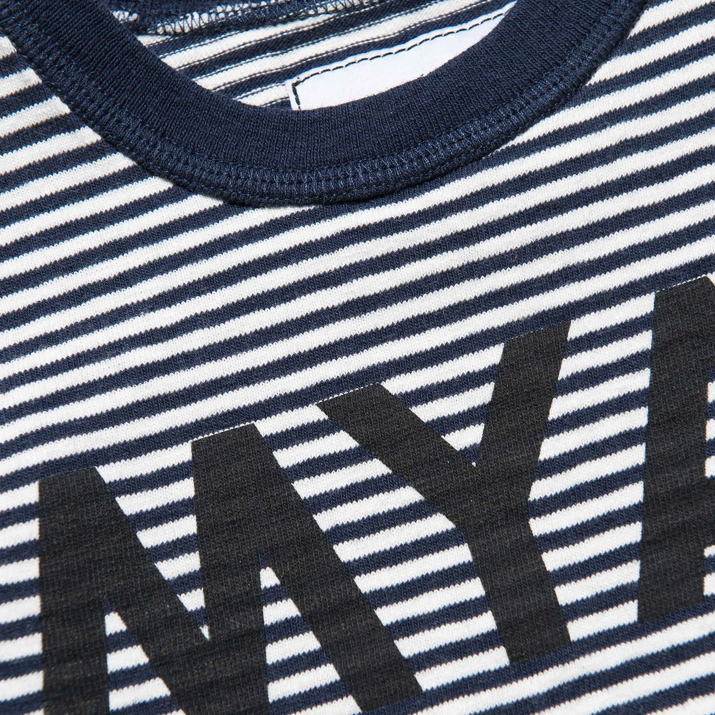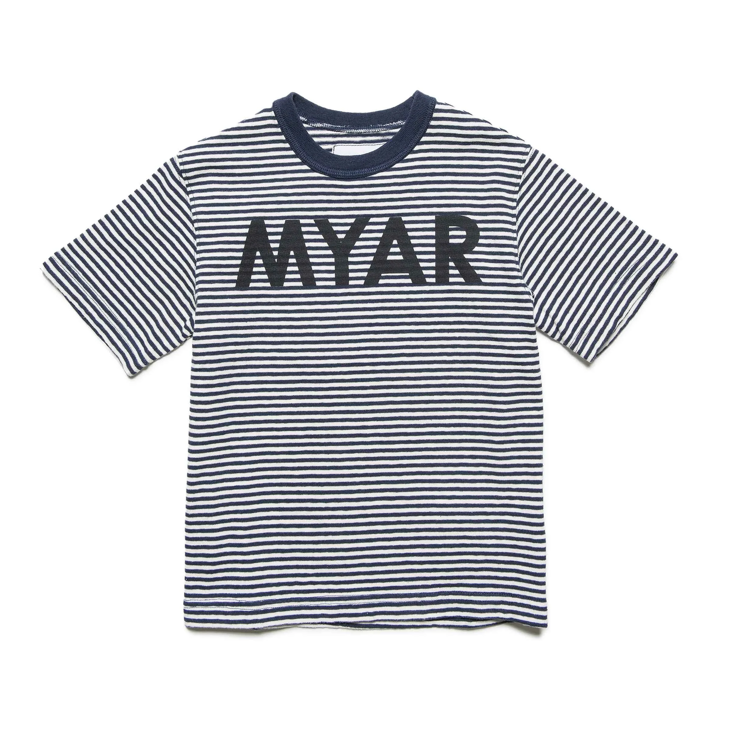 Regular fit T-shirt made from deadstock striped fabric inspired by the striped knit of Russian sailors; cotton jersey. Contrasting neck rib. Contrasting MYAR institutional logo graphic printed with bio-based inks on the front.