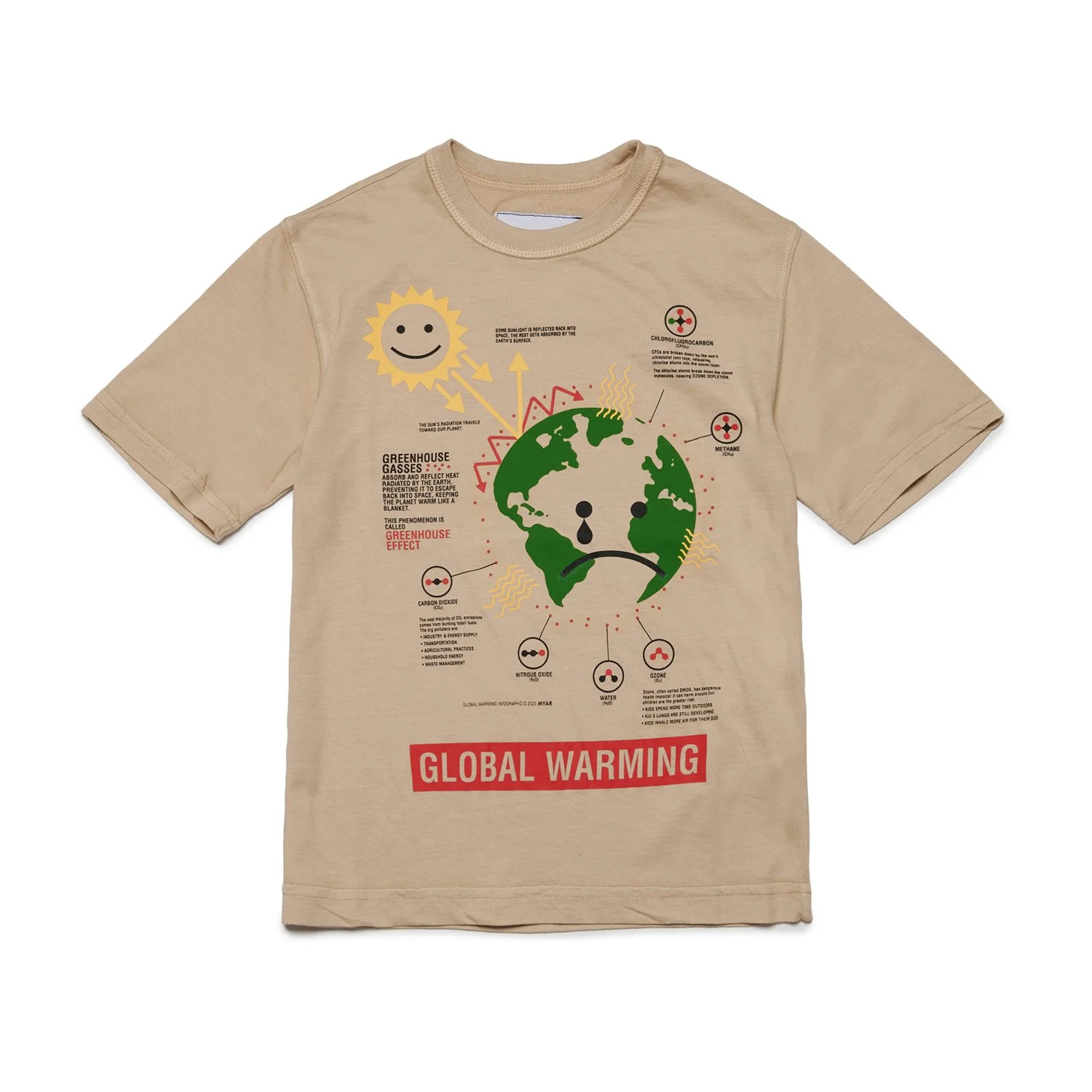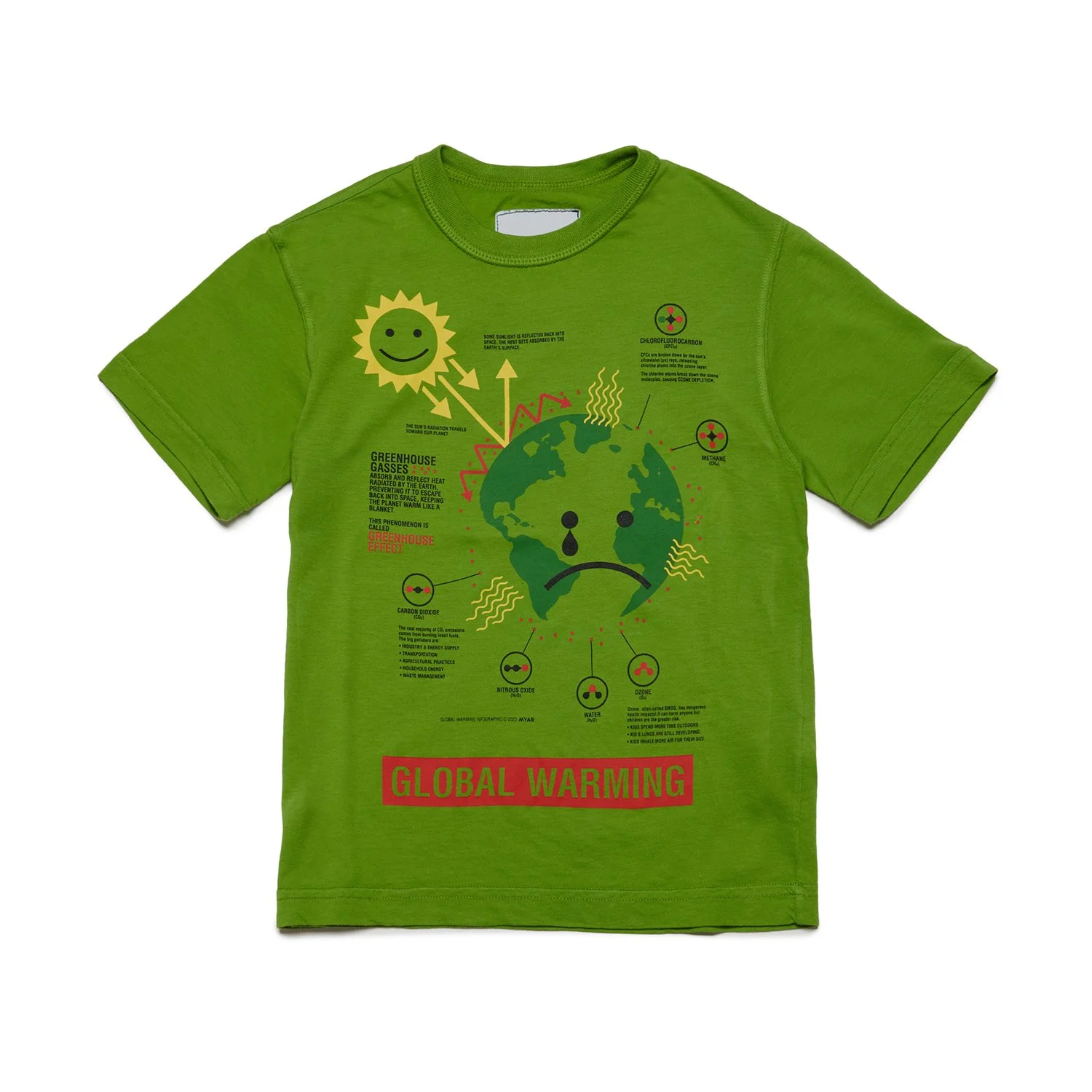The print on this t-shirt reworks traditional infographics through a child-like, playful filter, the causes of global warming, that is making planet Earth crying, are on show in a vibrant print.