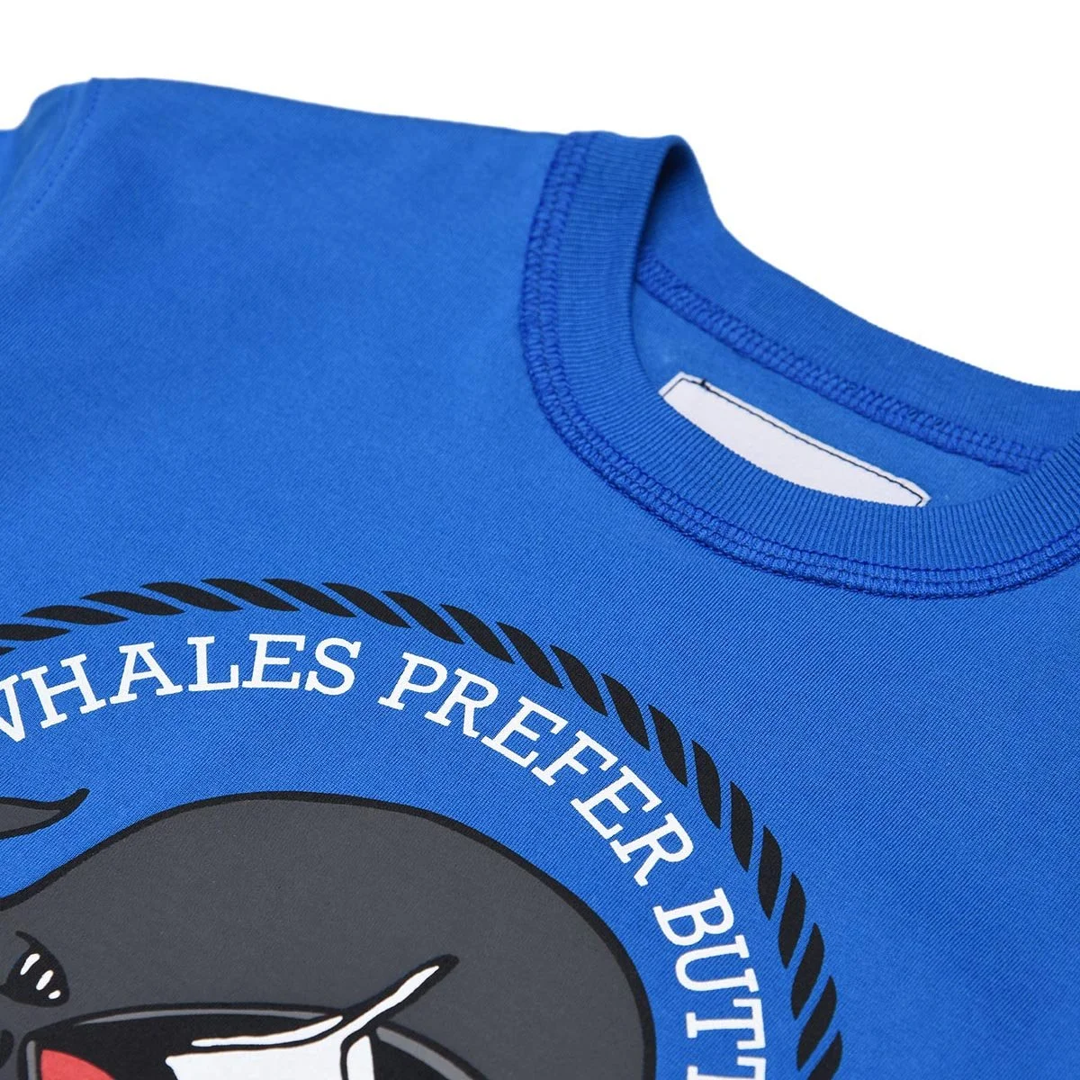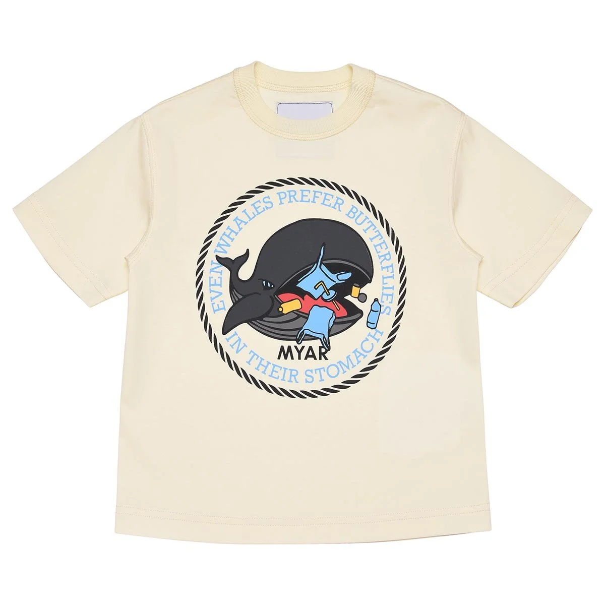 On the chest a water print with bio-based colour with the words EVEN WHALES PREFER BUTTERFLIES IN THEIR STOMACH (WHALE) which bears witness to MYAR’s commitment to raising awareness in adults and children about the importance of keeping our waters clean and showing the consequences of our actions on living creatures.