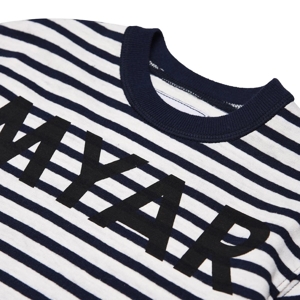 Striped deadstock jersey T-shirt with MYAR logo printed on the chest made using a water print with bio-based colour.