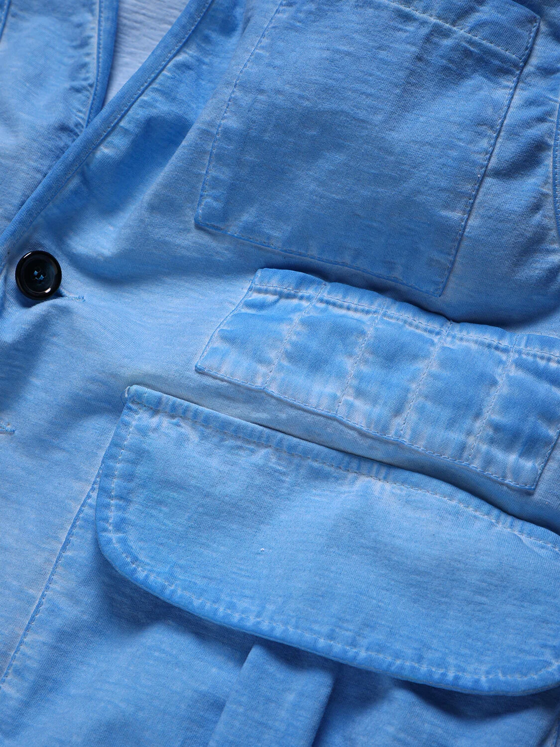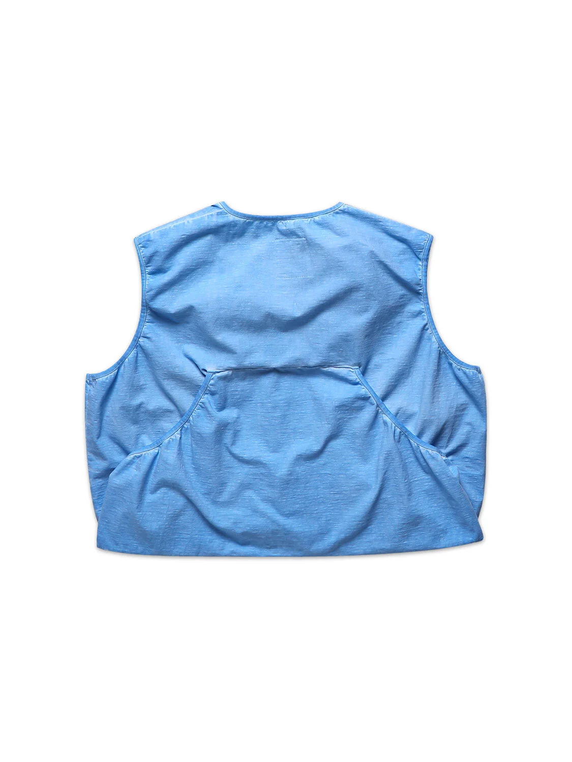 Vests inspired by those of the US airforce photographers, featuring multiple pockets we gave a comfortable soft touch to the vest by using a particular compact deadstock jersey fabric. Dyed at a certified local Italian supplier (Veneto Region) it comes in white and blue colors. The blue color fades unevenly on the jersey's surface with a different shades of blue, while the internal part has a slightly lighter blue.