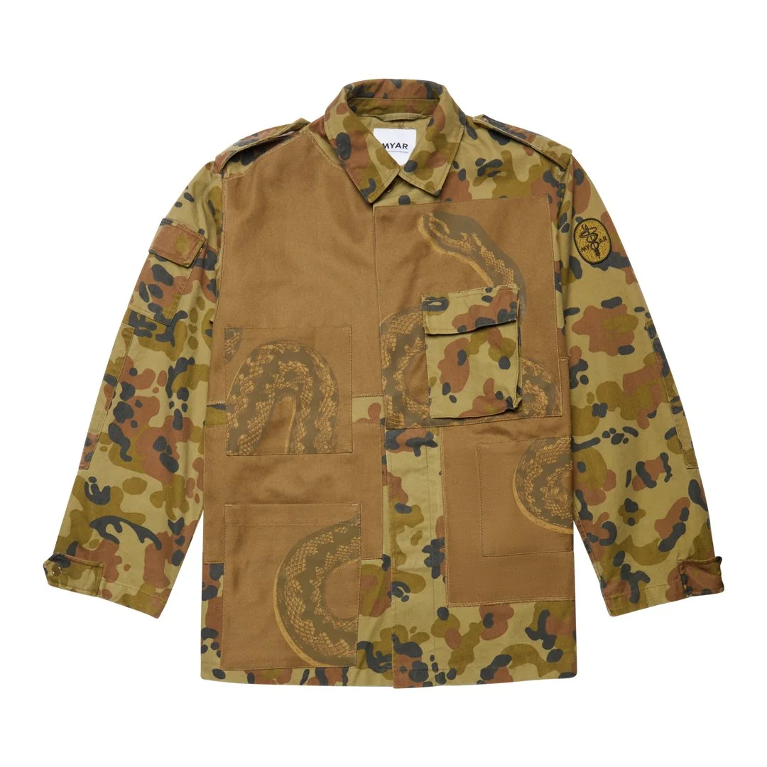 Vintage military uniform Jacket. Poplin patches are printed and then applied. Patch finishing with low and tight overlock.