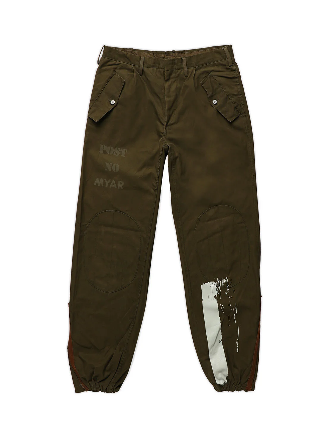 If jersey pants and sweatshirts, which are garment dyed with certified organic elements, exude a relaxed, effortless vibe, Myar’s signature creative artisanal craftsmanship results in a range of high-end garments, including revisited pants and shorts of the Italian army, as well as a field jacket with a Czechoslovak camouflage, as well as a Sweden military parka, all embellished with painted irregular stripes for a touch of sartorial appeal.