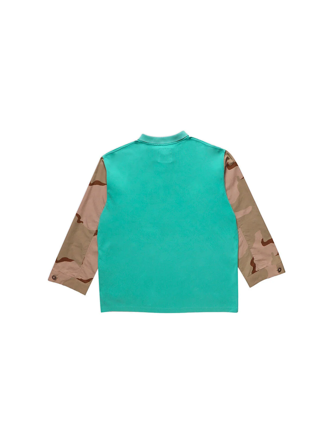 Playing with signature military references and its sartorial spirit, new emblems are printed on the upcycled Nineties’ rugby and polo shirts, showing pastel colors, pristine white poplin collars and patchwork sleeves in the US desert camouflage patterns, while the classic military ribbons are replace with a patchwork of stripes on a hybrid piece, combining the silhouette of a field jacket and a blazer.