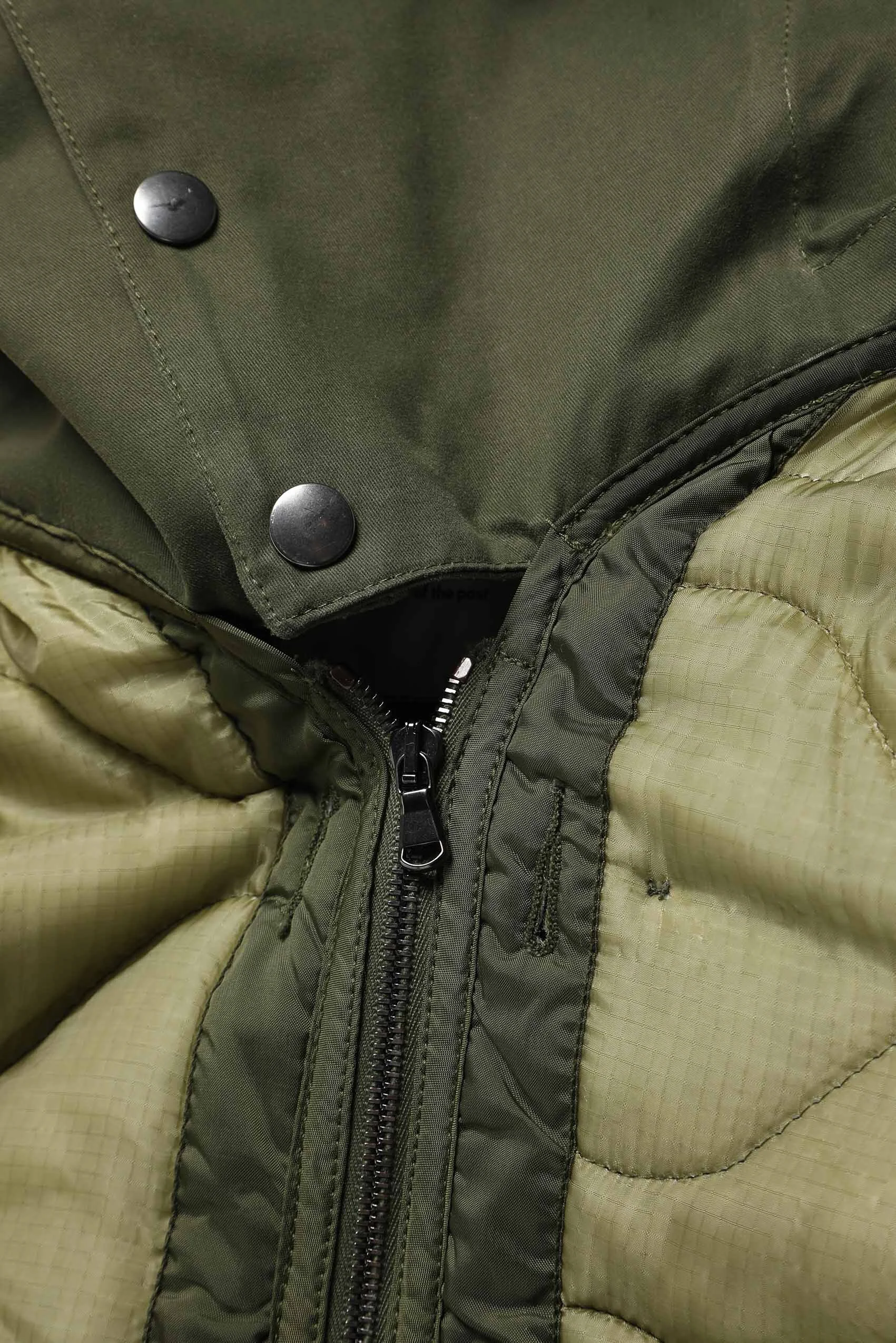 This two internal USARMY parka lining had been assemble together giving shape to a long padded jacket. We added a central double slider zip going from the top till little below the waist line, we add two lower pocket inspired by the M69 USARMY cargo pants using deadstock fabric, create two new top welt pocket using the original quinted lining fabric, we constructed a hood with a tree snap buttons closing using the same green deadstock fabric used for the cargo pockets.